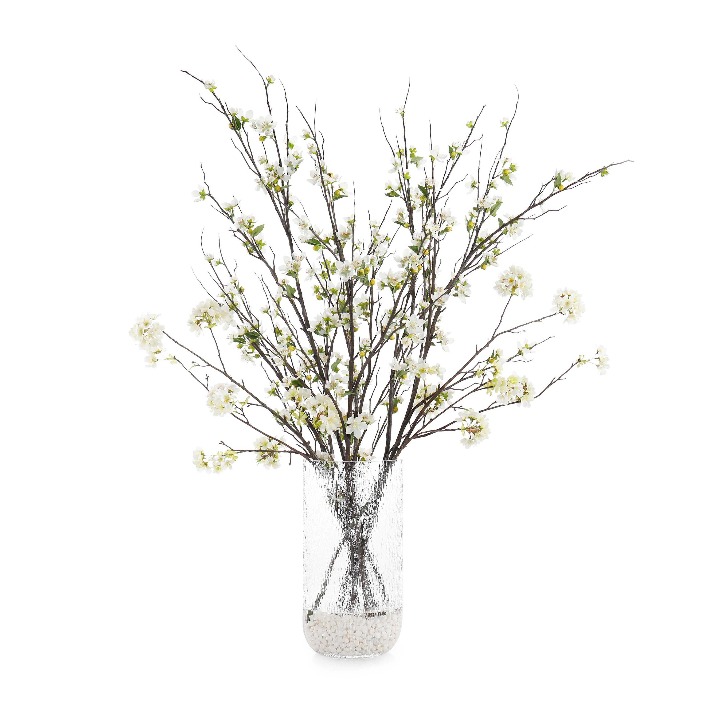 Blossoms & Branches features a gorgeous blend of apple and cherry blossoms displayed from a seeded glass vase with a tall, slender profile. Accents of white rolled marble rocks and faux water complete the look.