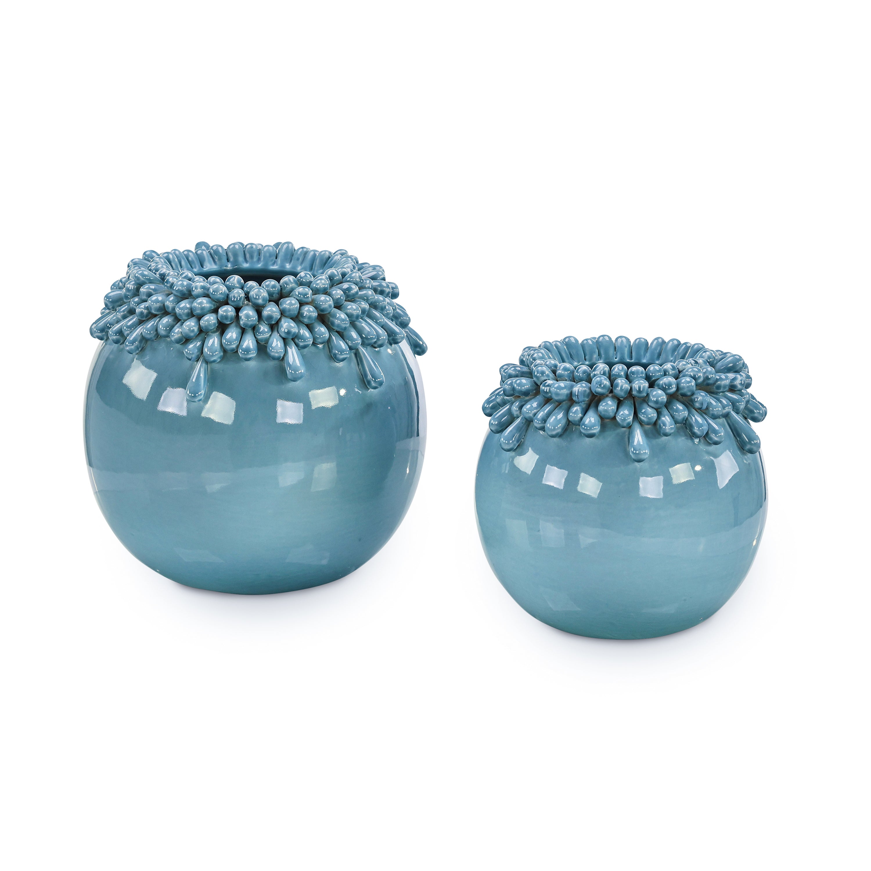 The Brigid Vases are two beautiful home accents, crafted from glazed ceramic with a blue tone, showcasing a spherical silhouette. Lively floral motifs in a matching white color adorn the rim, elevating the design with depth and dimension.