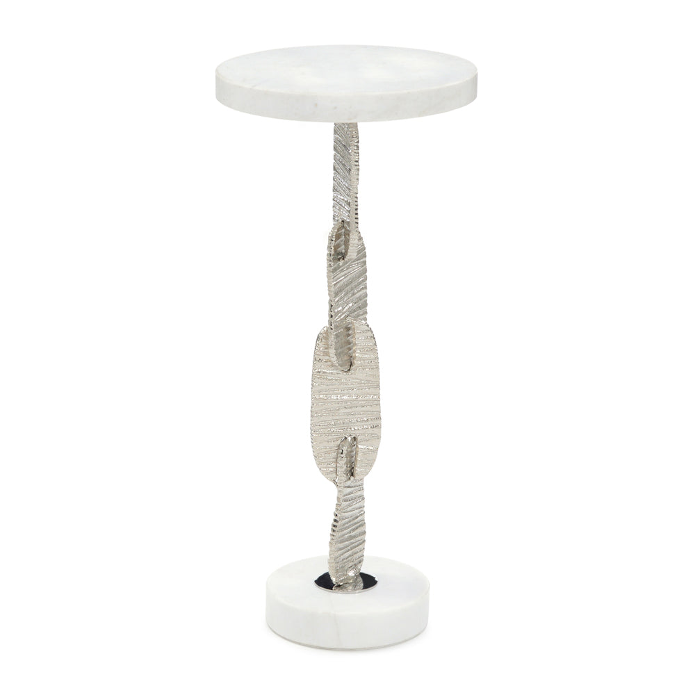 This Chase Martini Table showcases a sculpted link design in a nickel finish between a white marble top and base.