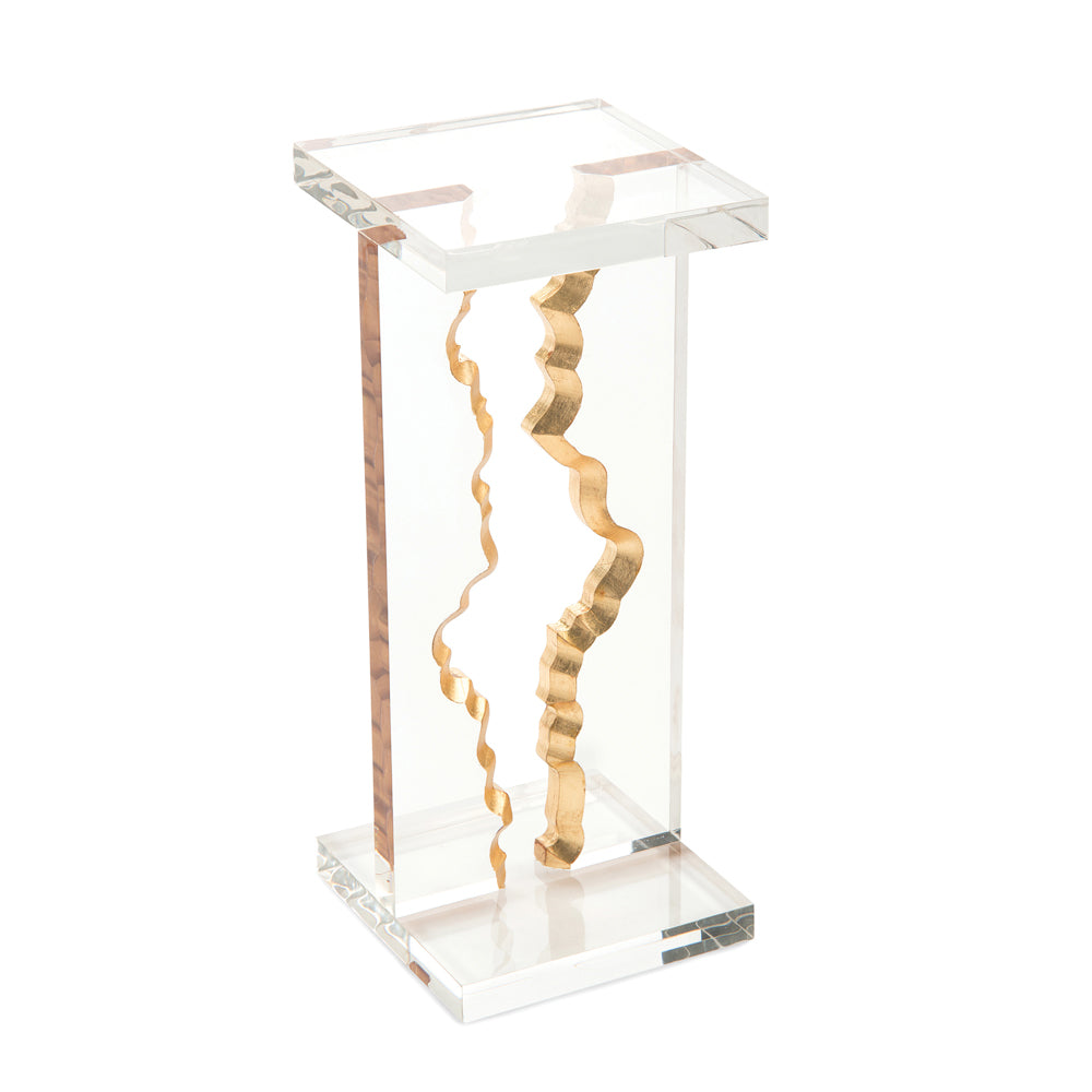 A divided landscape martini table in acrylic has edges in gold leaf.