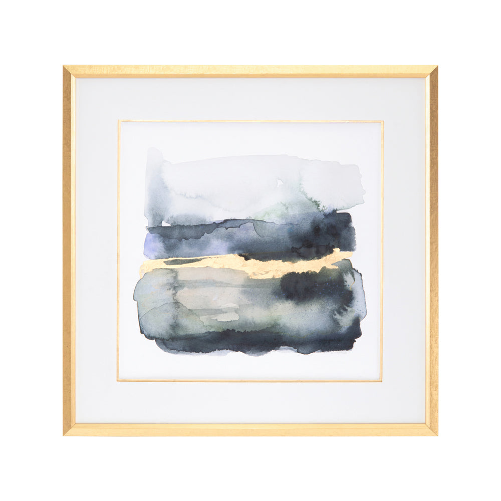 Golden Indigo is an abstract. The design has gold leaf applied on areas of blue and grey on a white background. The piece is framed in a narrow wood molding with a gold finish.