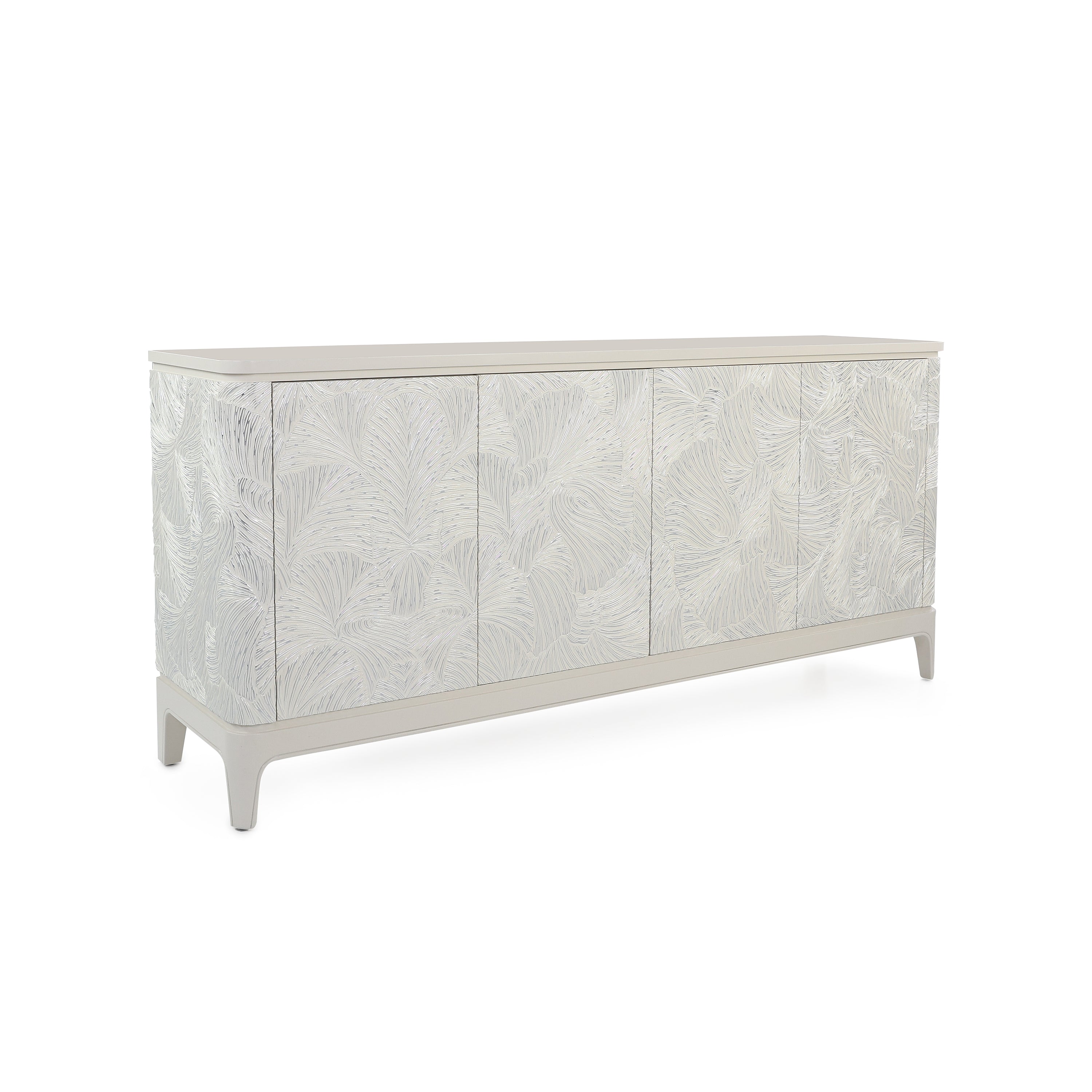 The Ivory Palms Credenza is a naturally inspired statement piece that infuses a space with subtle hints of the outdoors. Crafted from beech wood in a Silver Beluga finish, the sides and four push latch doors showcase a textural arrangement of flowing leaves. The base with four legs showcases an Ivory finish, matching the tabletop to complete the look. This gorgeous credenza features three interior compartments, each with an adjustable shelf.