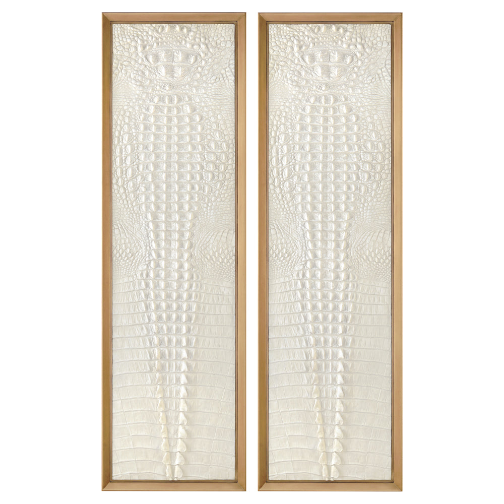 This matching pair of wall panels features full-hide faux crocodile skin. They are finished in variegated cream and white. Chamfered frames in brushed brass surround each panel. These panels are designed for portrait or landscape orientation. French cleats are fitted.