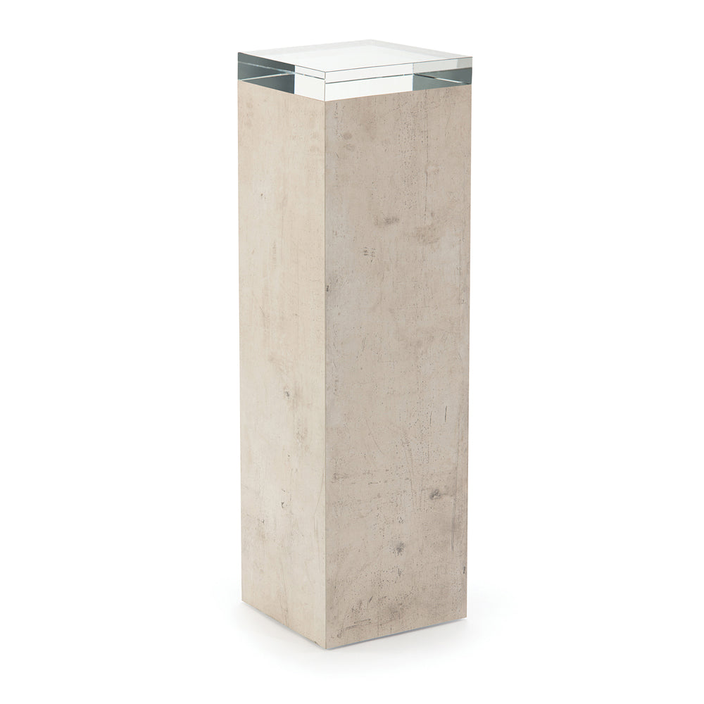 A modern pedestal is finished in tiza gesso and paired with a crystal top.