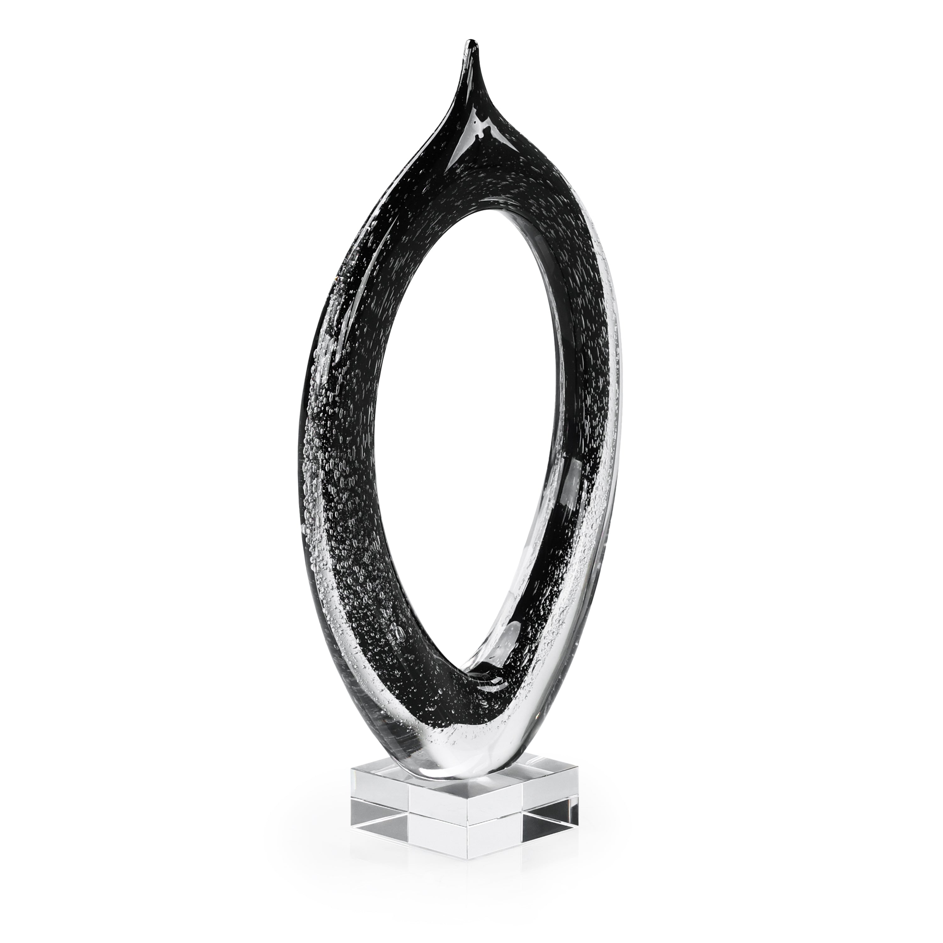 The Loop Sculpture is a decorative tabletop accent that introduces seductive curvature and rich visual depth. Crafted from seeded, mouth blown art glass, the sculpture showcases a stylish loop in black with clear-toned accents. The sculpture gently rests atop a square crystal base.