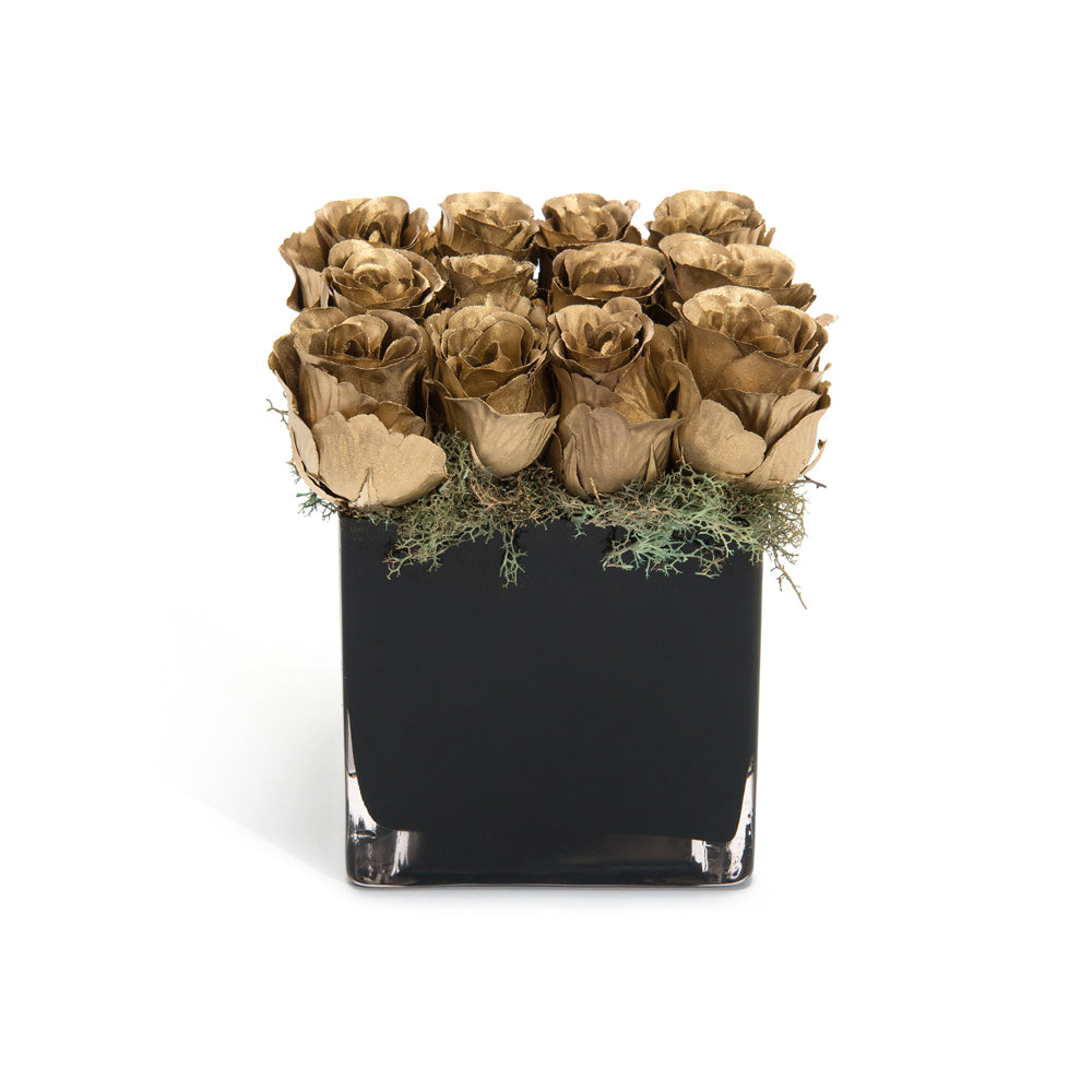 Gold dust roses are set in a black cube porcelain vase with natural golden reindeer moss.