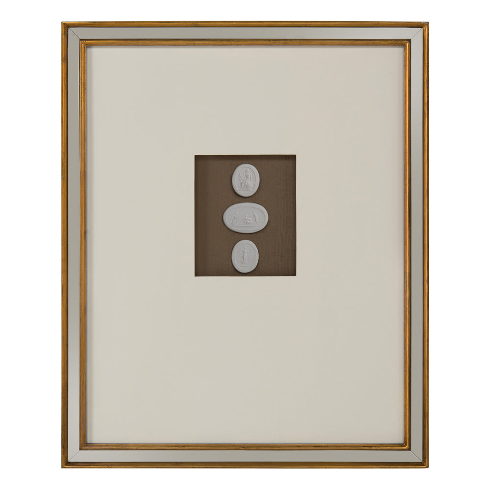 Hand-cast plaster pieces are set on a rich, brown-painted fabric, surrounded by a thick ivory mat and a beautiful gold and mirrored frame that sparkles.
