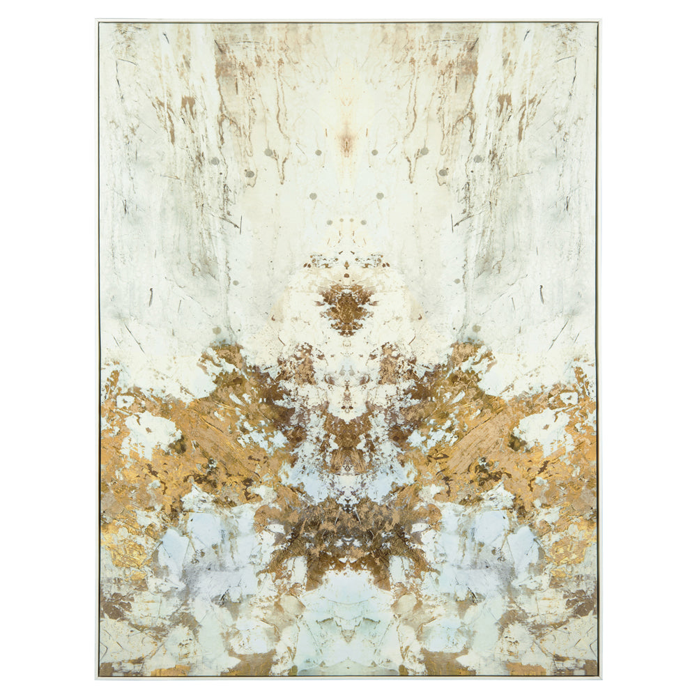 This celestial abstract by Mark McDowell, with textural and gold-leaf detailing, has a broken vitreous finish. The piece is framed in a white wood floater molding.