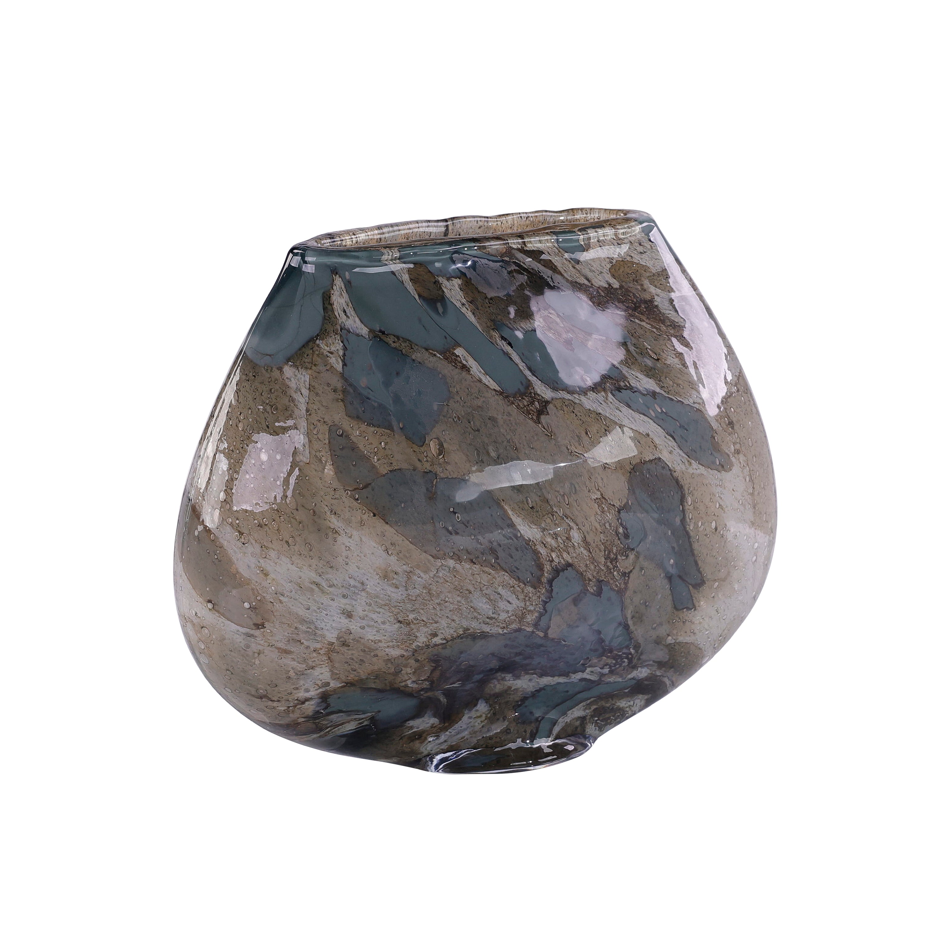 The Mirage Vase is a stylish accent that combines a sleek, curved silhouette with abstract flourishes of color. This rounded vase crafted from clear mouth-blown glass features a stunning blend of blues and grays to result in a dreamy, ethereal look. `