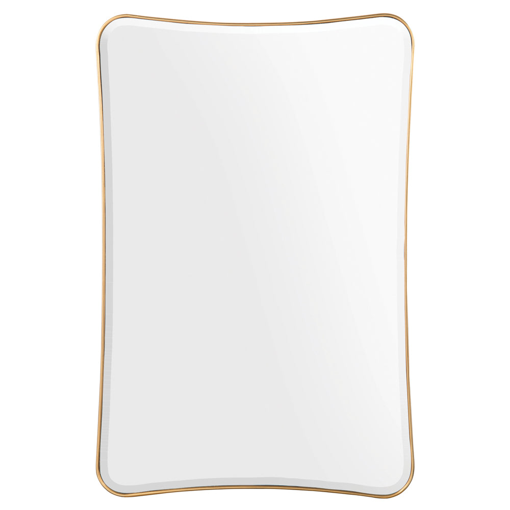 The modern beveled edged mirror is framed by a simple waisted frame finished in gold.