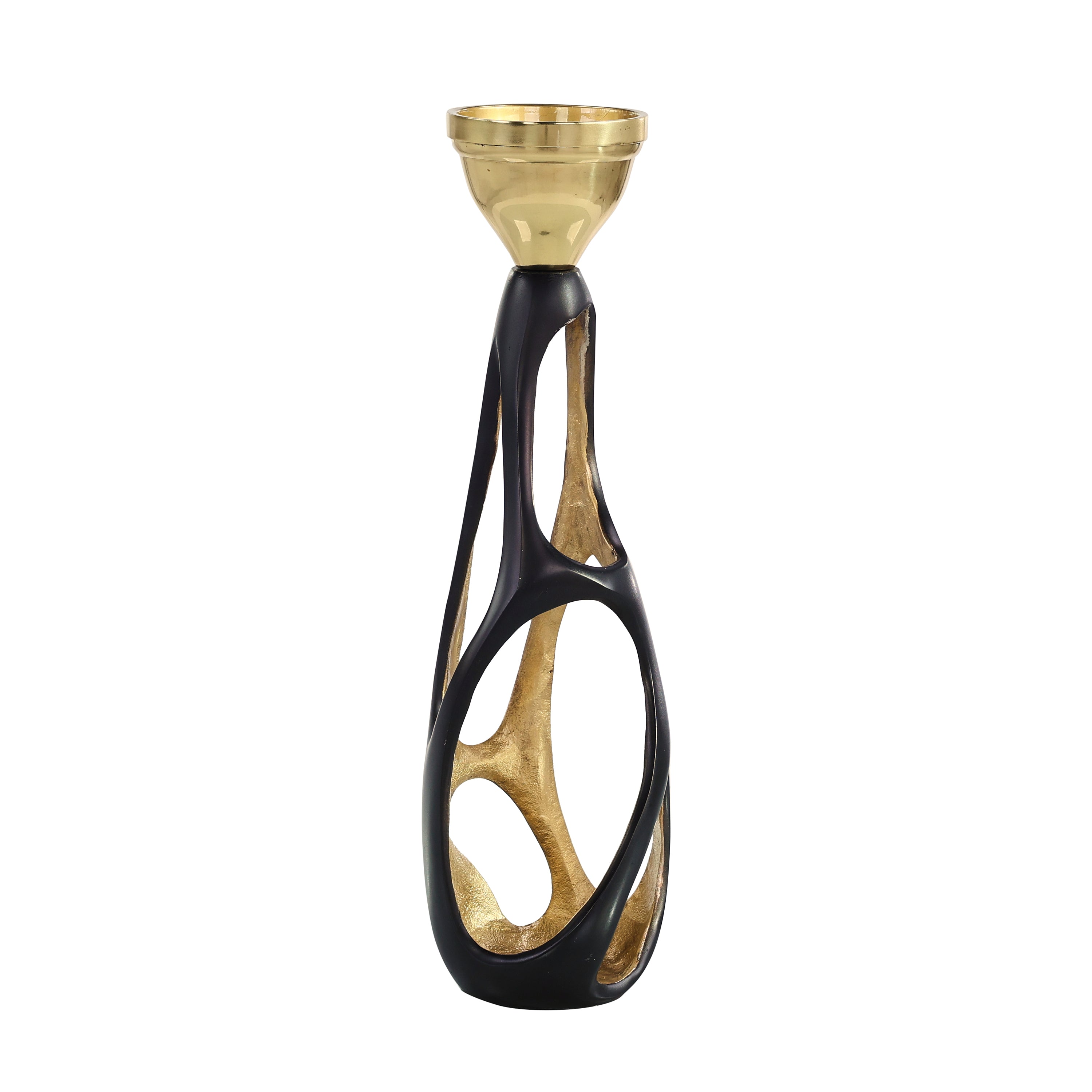 The Nexus Candleholder is an elegant design that showcases a masterful use of negative space. This aluminum piece with a brass socket features a two-toned finish of Dark Bronze and Champagne, The body is constructed from connecting strands of flowing metal for a unique, abstract look.