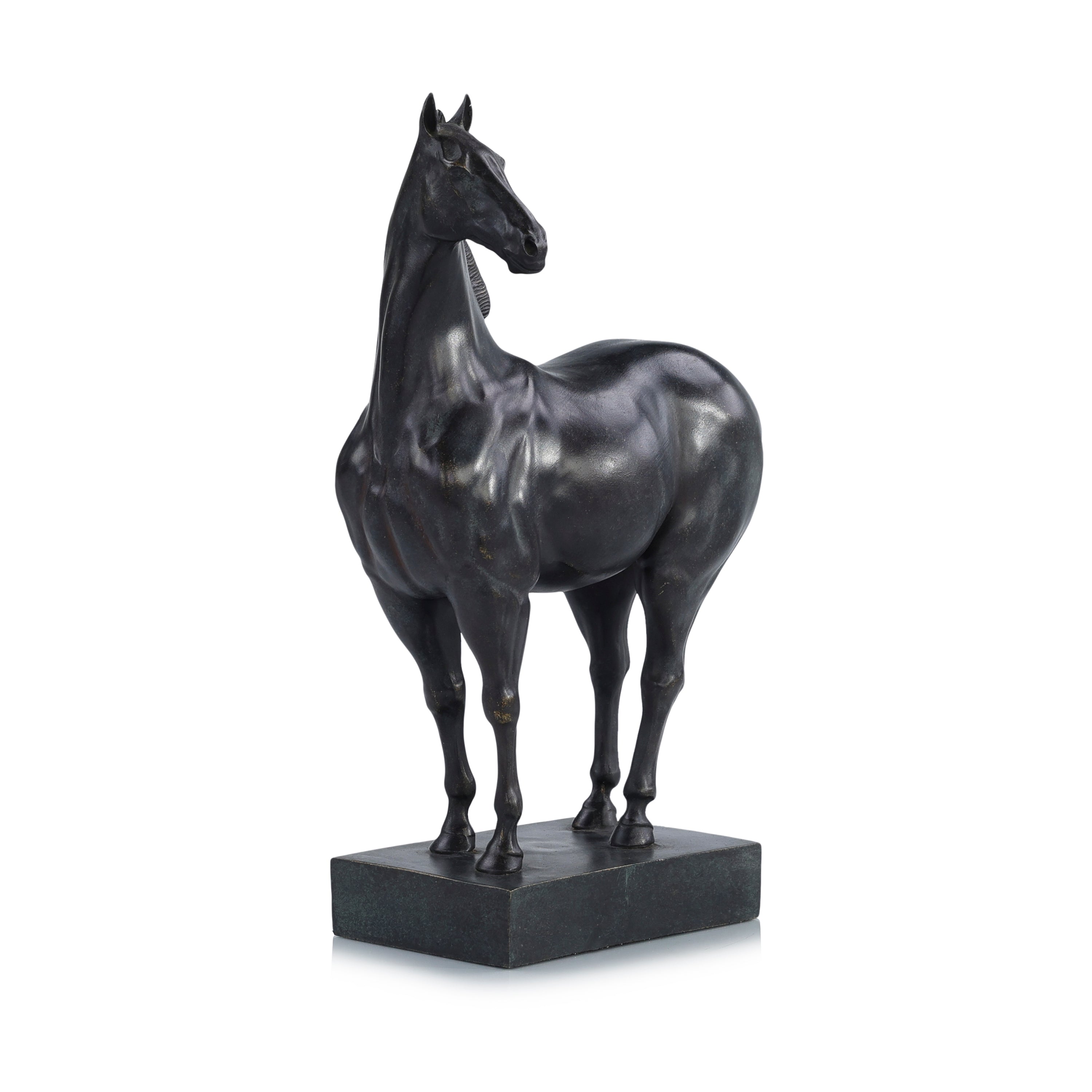 The Noble Steed Sculpture is a stunning, intricately detailed representation of a horse in a dignified pose. The horse showcases a stylish black color that pairs with a matching square base.