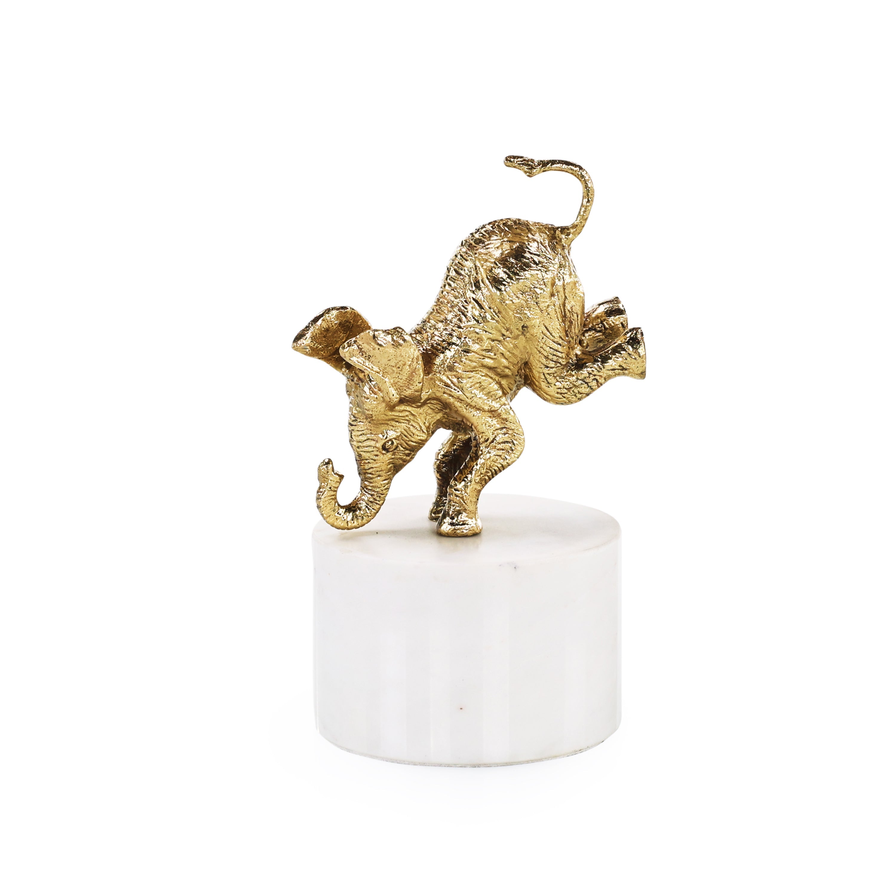 The Playful Elephant Doorstop is a unique home accent depicting a brass elephant in a whimsical pose. Performing a handstand atop a weighty base of natural white marble, the elephant uses its hind legs to reliably brace any door in a space.