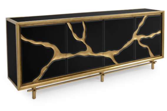 An awe-inspiring statement piece, the Ravine Black Credenza showcases bleeding-edge contemporary design and a seductive color palette. The beech wood frame is enveloped in gorgeous panels of black mirrored glass. These reflective black surfaces are beautifully accented by raised edges in an Etruscan Gold finish. These opulent tones extend to the base of steel legs, as well as a magnificent artistic display along the facade of the piece. Along the four doors, a shattered design contributes forks out in all directions, imbuing the piece with textural depth and stunning curvature.