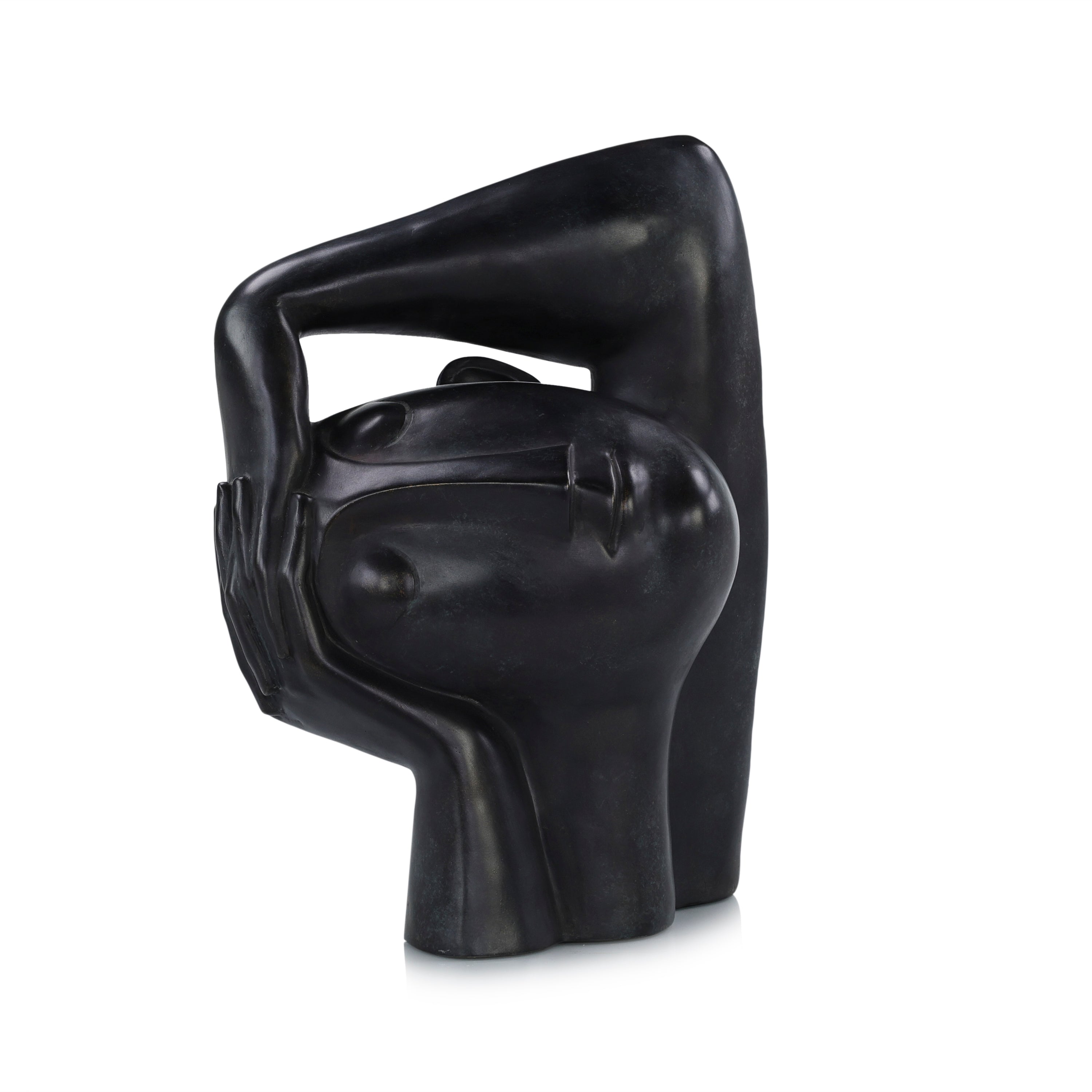 The Restful Slumber Sculpture depicts a human figure with exaggerated features cradling their head in their arms, as if preparing for sleep. This piece, crafted from black composite, creates a unique focal point in any interior space.