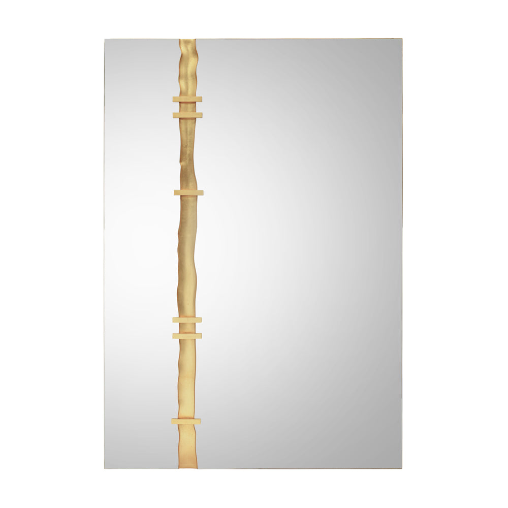 Golden rivets appear to hold both sides of this rectangular mirror together across a crevasse, also finished in exotic gold.