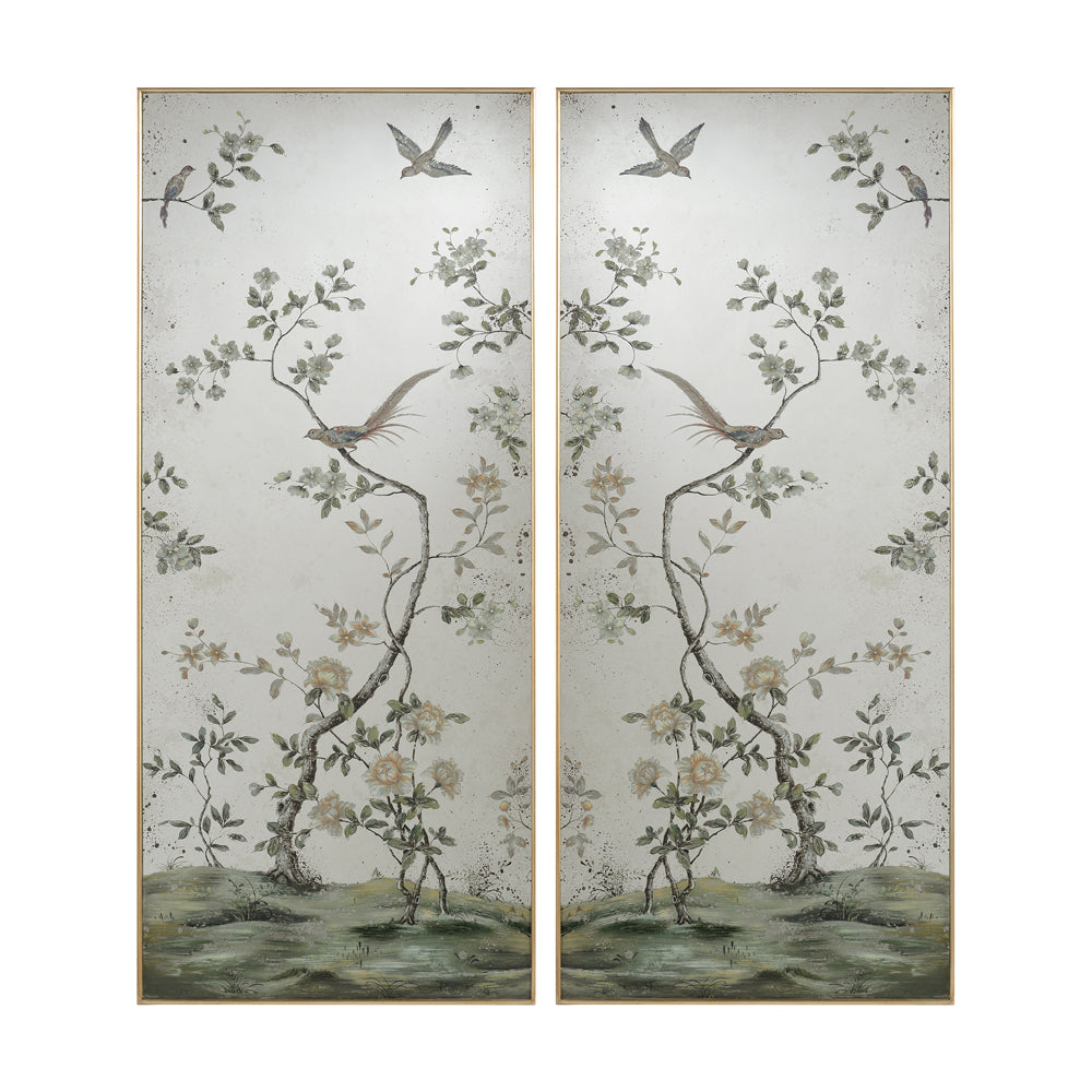 A pair of reverse hand painted mirrors framed with delicate cock bead moldings in Valyrian gold. The painting features a scene fauna and flora. French cleats are fitted