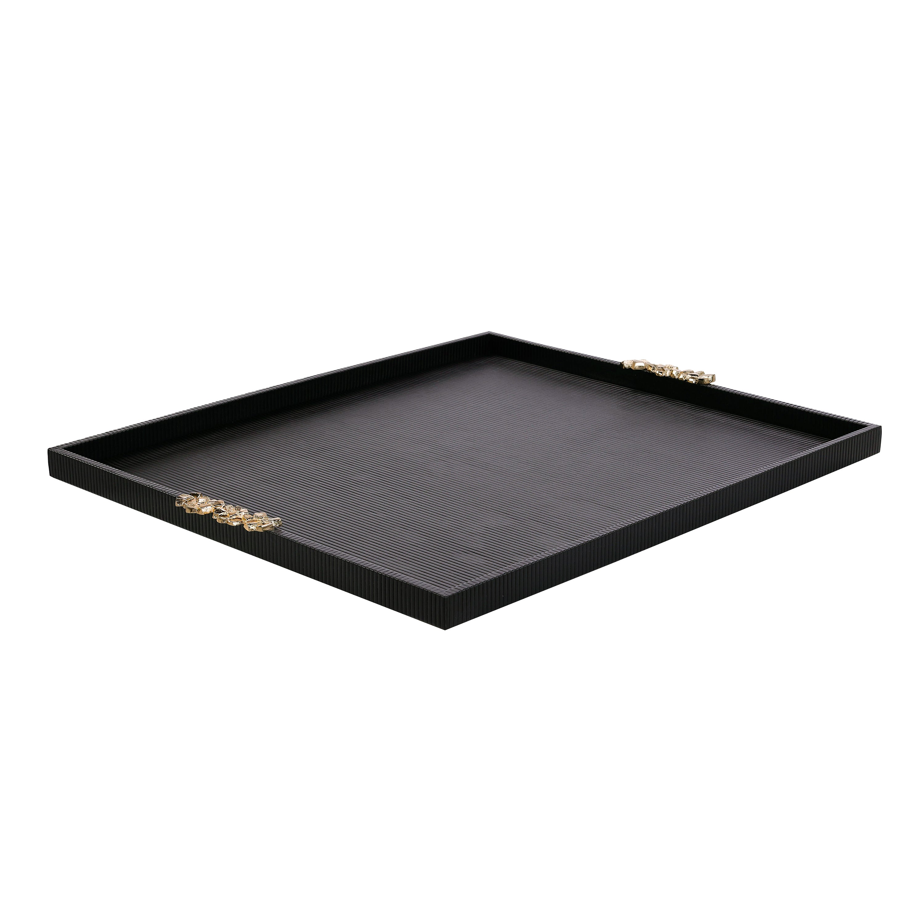 The Shard Tray is a sleek, contemporary accent piece that showcases a gorgeous blend of textures and tones. This black wooden tray displays a mesmerizing pattern of parallel lines along the interior surface, playfully contrasted by aluminum accents in a golden hue that adorn each handle. These golden accents feature a shattered motif, displaying a variety of opulent tones.
