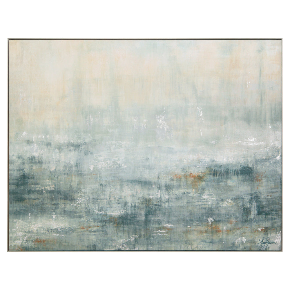 This art by artist Shaye Rawson represents a calming Summer Mist. The piece is embellished with silver leaf and textured with lifelike texture. The artwork is raised in a silver floater frame to give extra Depth.