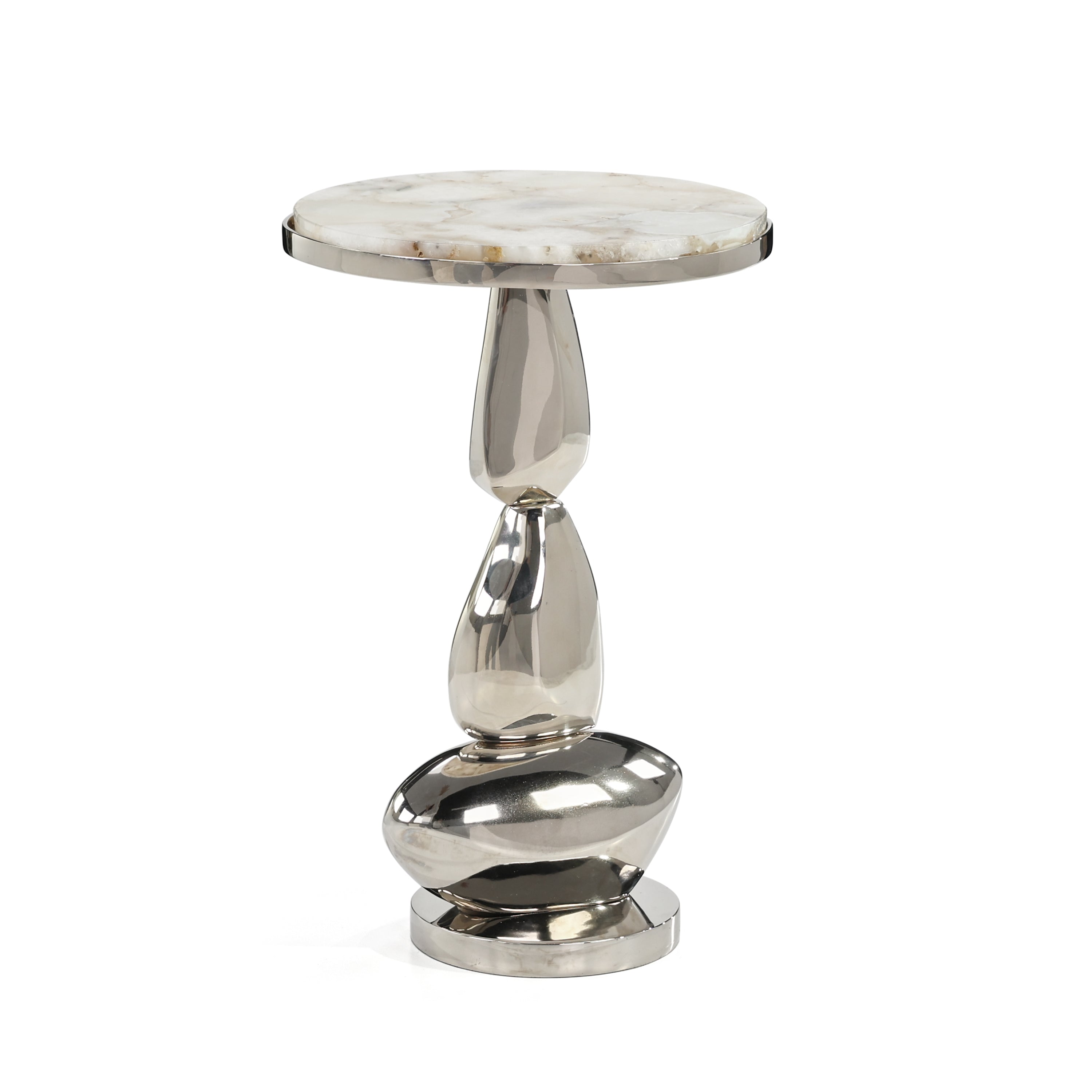 The Smelted Martini Table is a creative accent piece, evoking the unique look of molten metal. Crafted from aluminum and brass in a Polished Nickel finish, the table is constructed from three asymmetric shapes supporting a beautiful tabletop of white agate. Motifs of flowing metal contrasted against the clean cuts of the natural stone create a stunning focal point in any interior space.
