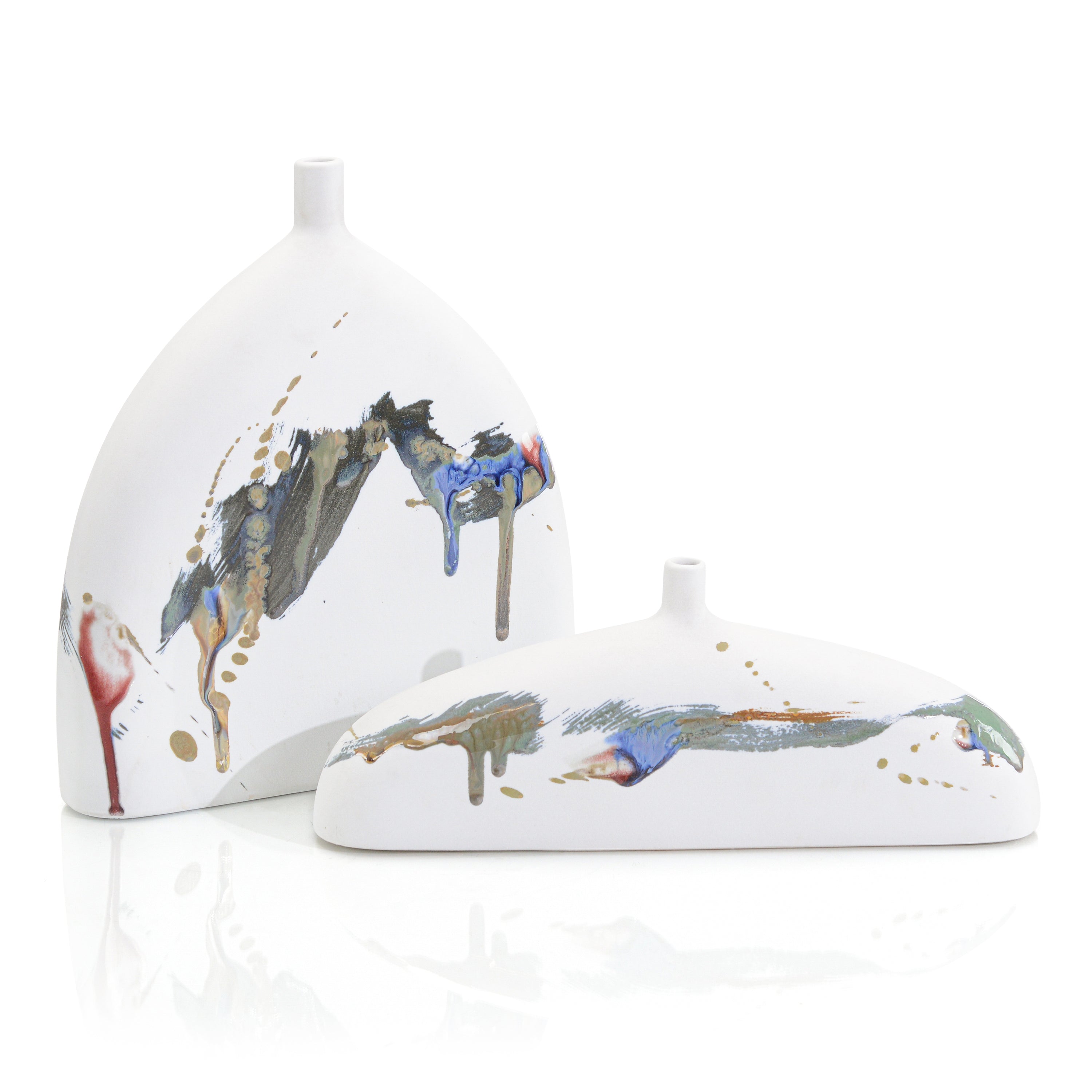 The Color Splash Vases are tasteful decorative accents for introducing subtle artistic strokes to an interior space. The pieces are crafted from white porcelain and feature an abstract, hand-painted design that showcases a wide variety of colors.