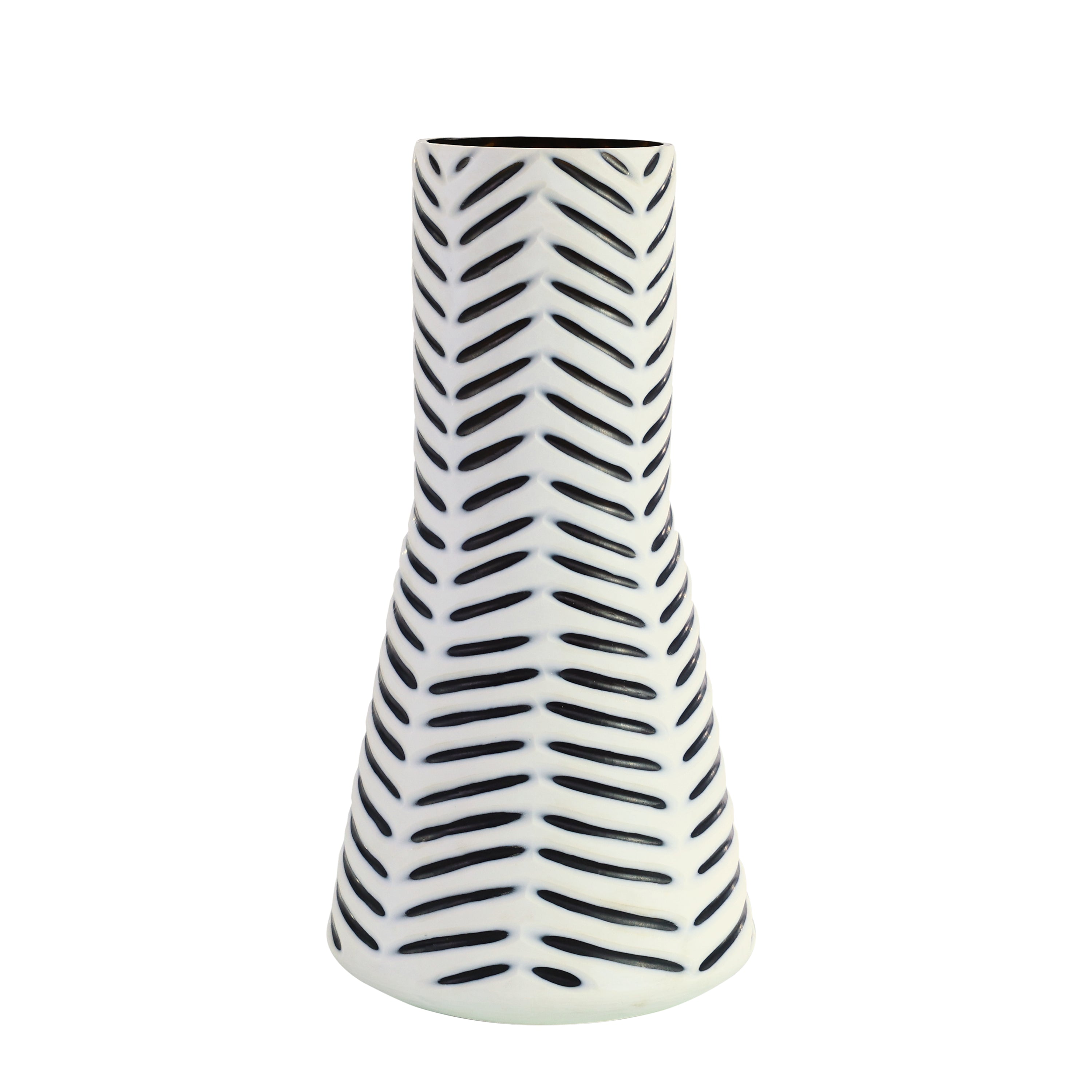 The Vienna Vase is a stunning contemporary design that elevates an interior space with refined tones and rich textural depth. This white glass vase shows a masterful use of negative space with an array of slender openings, subtly arranged in a segmented chevron pattern.