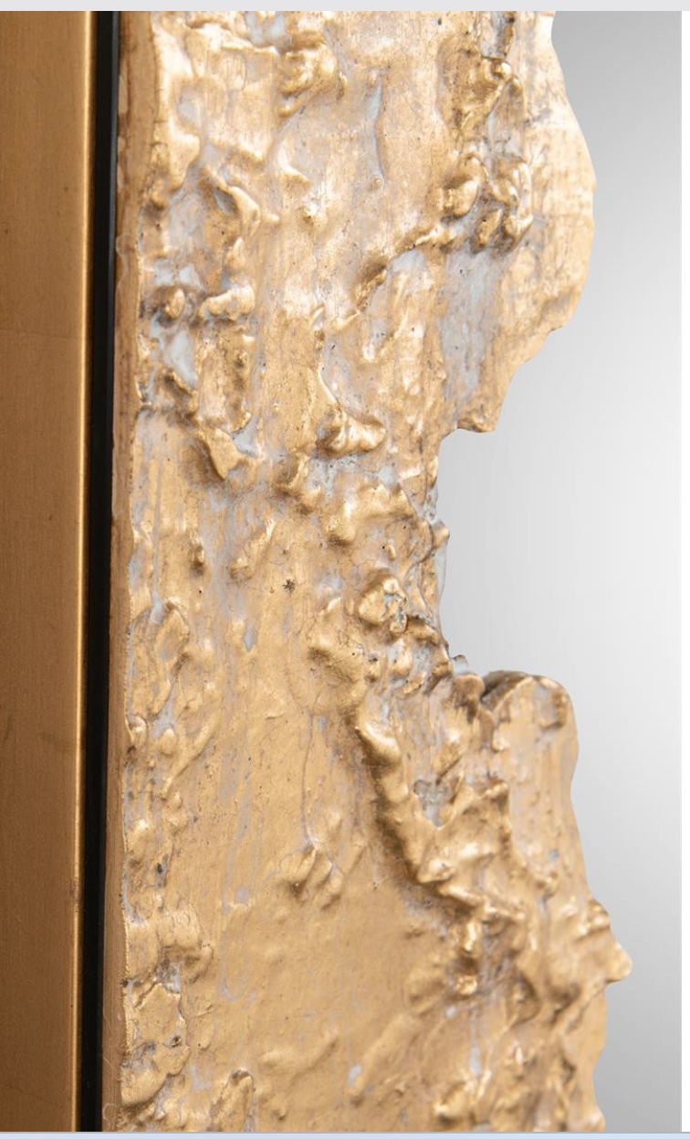 This transitional mirror features side frames in a molten relief texture of washed gold and a gold coast finish. French cleats are fitted.