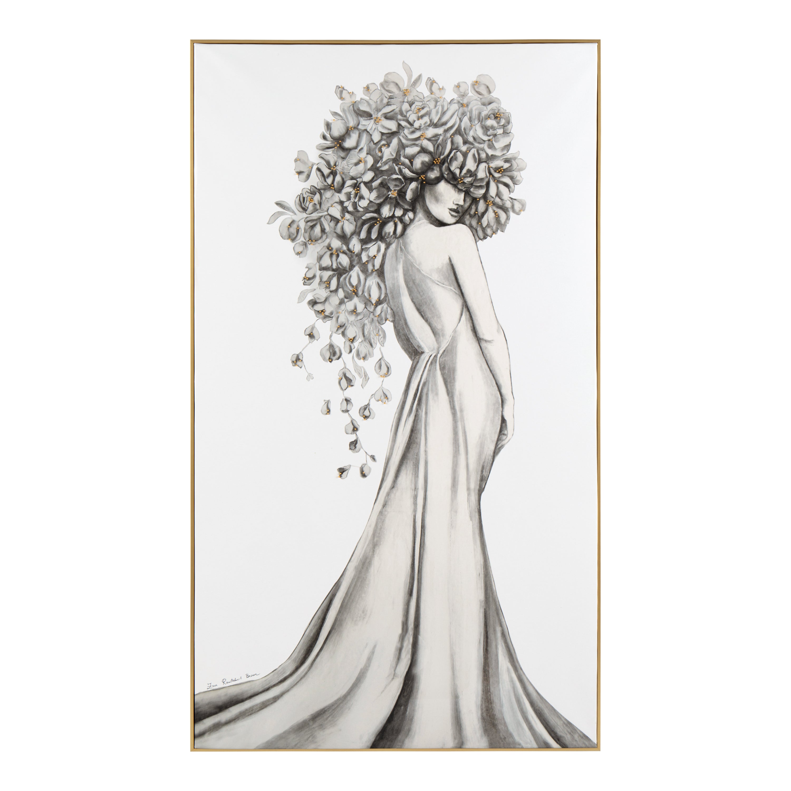 The Intoxicating Dream by artist Zana Brown showcases a spectacular human figure in a gorgeous dress. Vivid flora atop the subject's head is embellished with gold pins, elevating the work with opulent tones. This piece on canvas is sealed in a satin finish and displayed from a gold floater frame.
