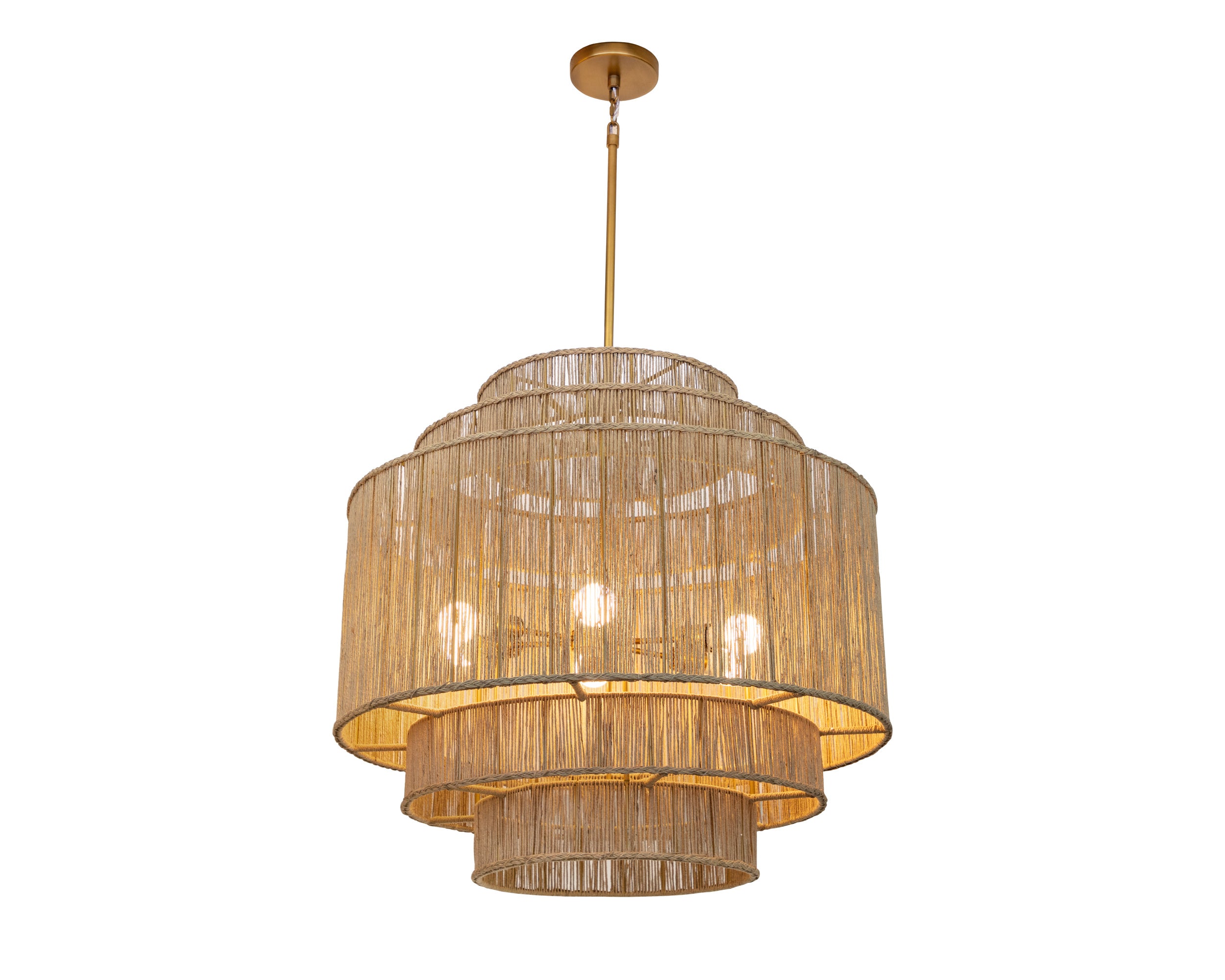 Each of the five tiers of the Alyssa Chandelier is carefully handwoven with jute, highlighting its enduring beauty. Suspended from an antique brass rod, this chandelier brings a light airy look to any room it is placed in.