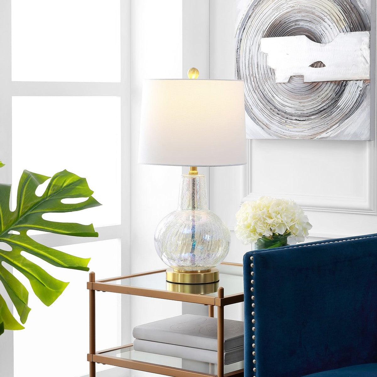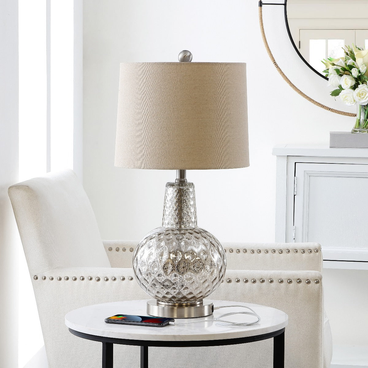This stunning contemporary table lamp radiates beauty. Designed with mercury glass, its hammered texture instantly upgrades any room with its modern luxurious style. Often used in by designers in pairs to frame a sofa.