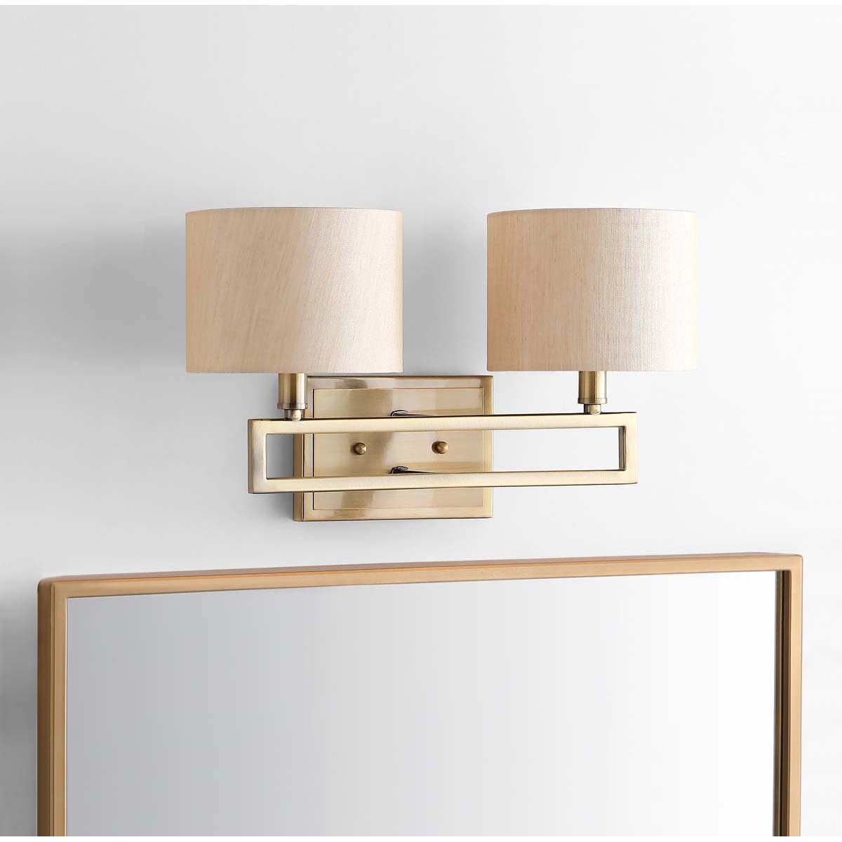 Contemporary design and Arts & Crafts styles converge in the simple transitional lines of the Catena Sconce. This handsome double light fixture is crafted of steel with an antique gold finish and paired with fabric shades in cream for a room flattering glow.