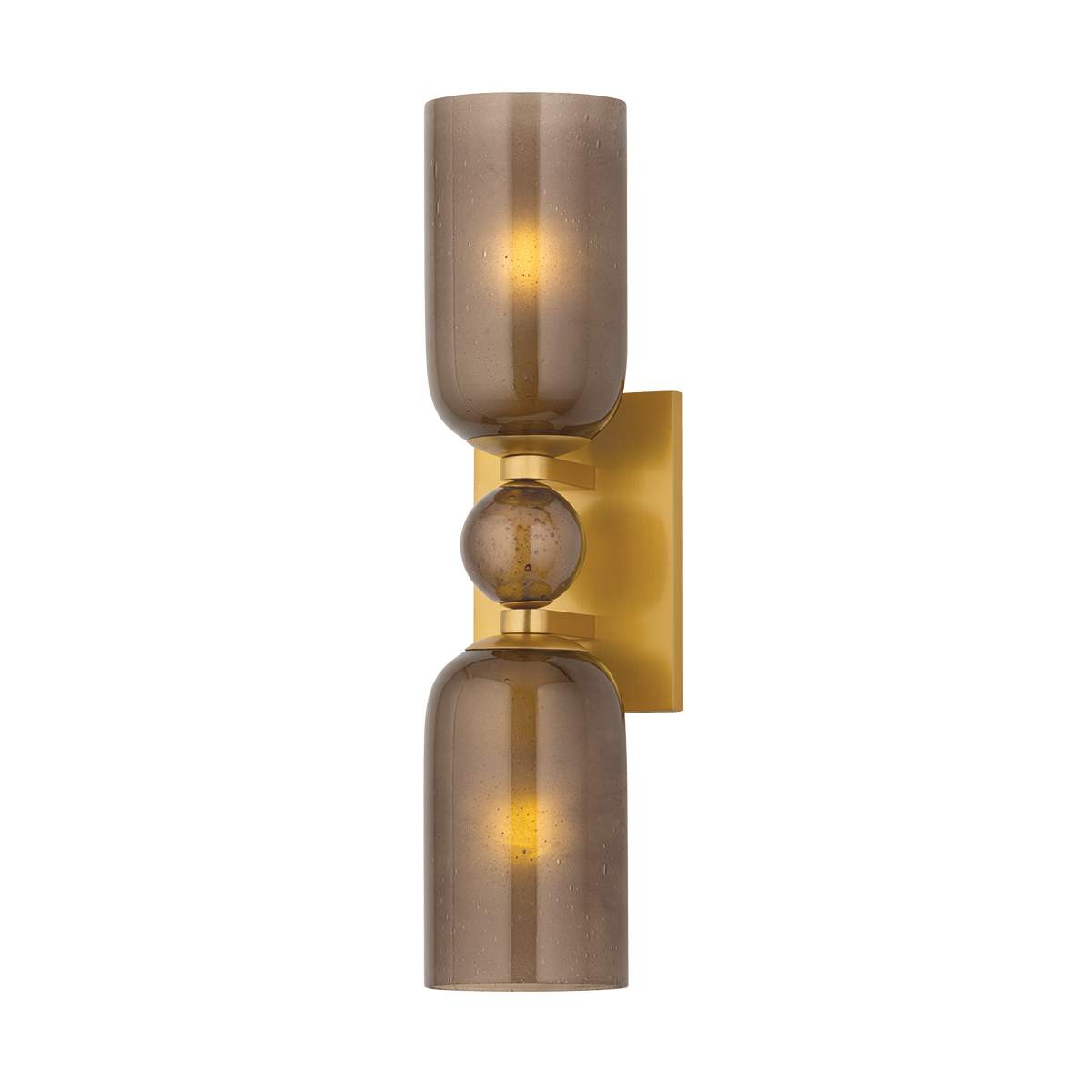 The Hurleyville sconce celebrates the beauty of Indian glass craftsmanship. The stacked composition includes two light bronze seedy glass shades and a matching orb. A slightly bubbled texture in the glass adds to the graphic appeal of the design. Finished with Aged Brass metalwork, the overall effect is fresh and playful as Hurleyville elevates lighting to a work of art.