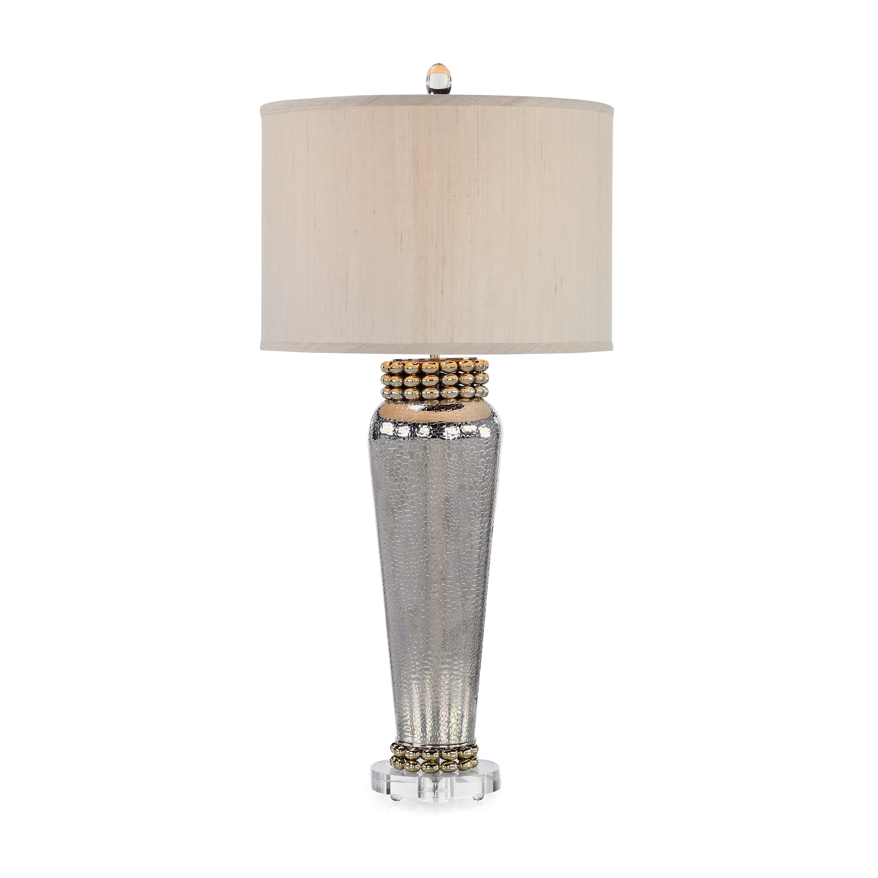 The Johanna Table Lamp is a naturally inspired design statement elevated through chic contemporary charm. This brass lamp with a cylindrical shape showcases a stunning crocodile skin texture in a Nickel Brass finish. The neck and base showcase a stylish arrangement of Polished Brass spheres, infusing the piece with visual depth. The piece sits atop a round base of clear acrylic and features a matching egg finial. The look is completed by a drum shade in a pristine white tone.