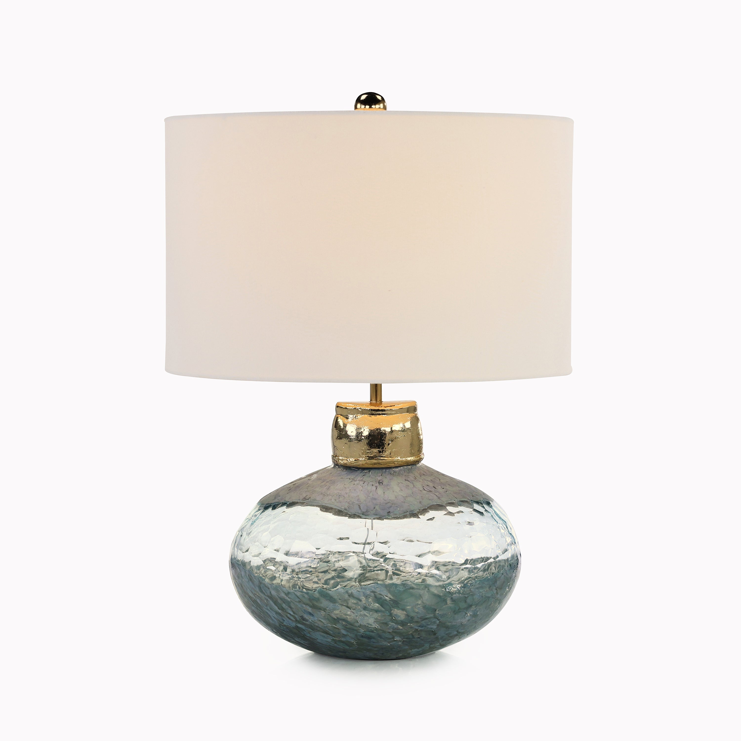 The Noctis Table Lamp is a stunning design statement that commands attention within a space. This art glass piece features a textural, two-toned look that displays a transparent center between solid blue tones. A large, asymmetrical neck accent in a Champagne finish matches the tones of the hardware and ball finial. The look is completed by large white drum shade.