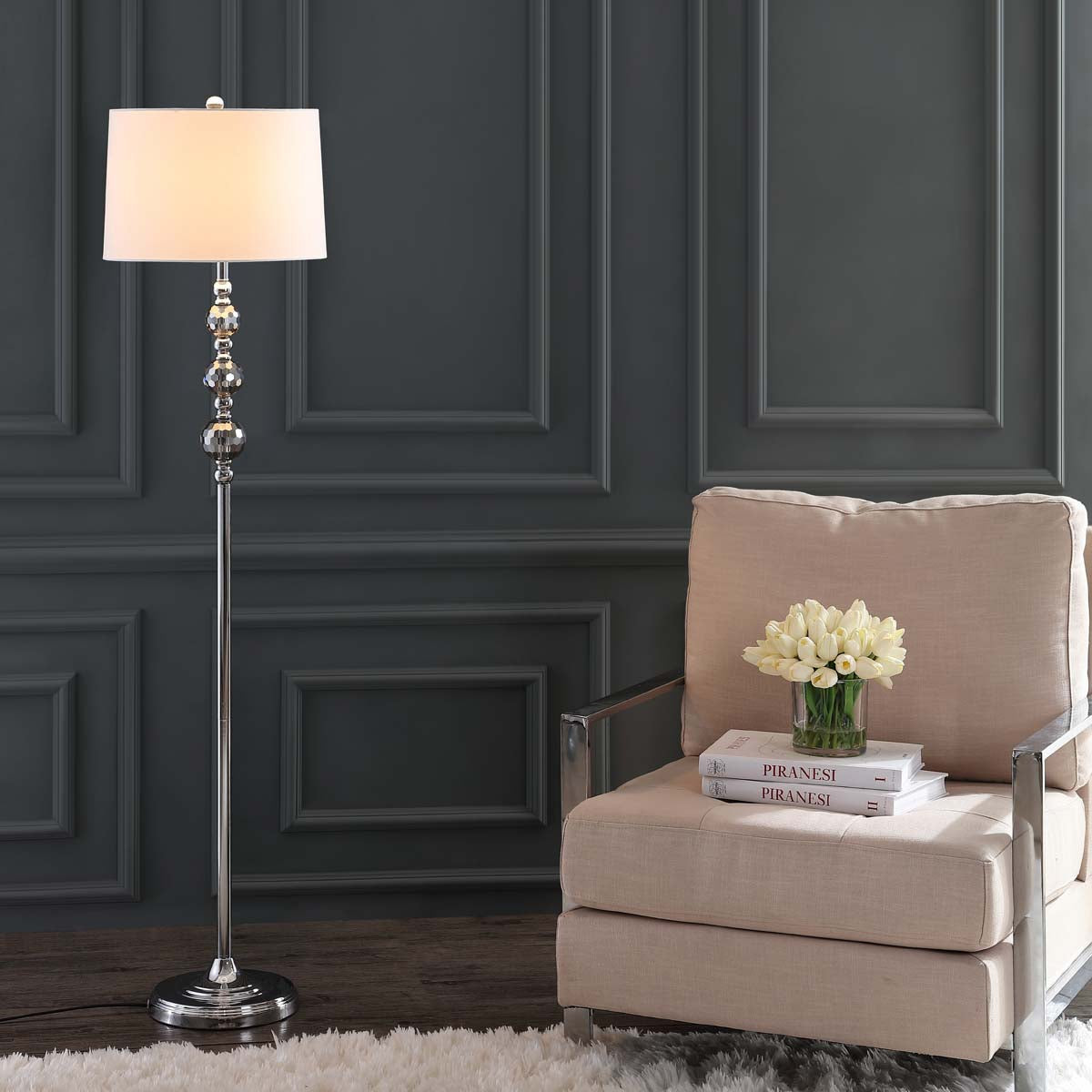 Posh and polished, this cosmopolitan floor lamp updates any living room with its gracious style. Designed with the curves of a classic candlestick base, its bright chrome finish is paired with the crisp, clean lines of its elegant complementary shade.