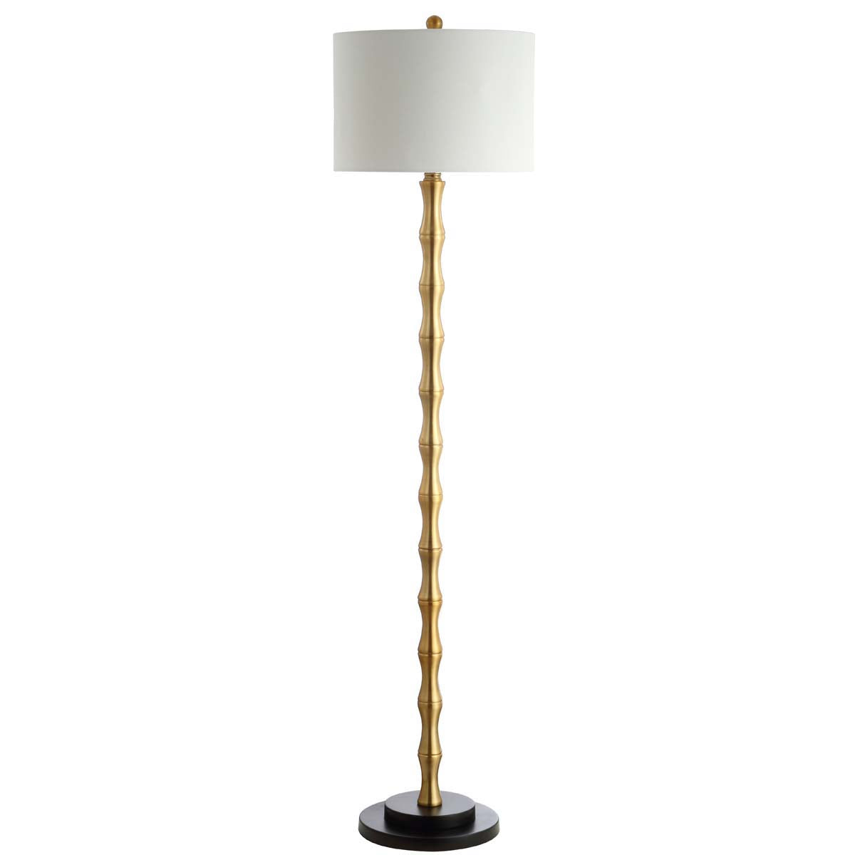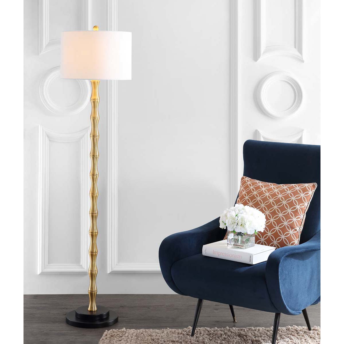 Chic and sophisticated, this posh contemporary floor lamp instantly updates any living room with its stunning sculptural style. Its sinuous curves are illuminated with a luxurious antique brass finish, and its off white 100% cotton shade is complementary.
