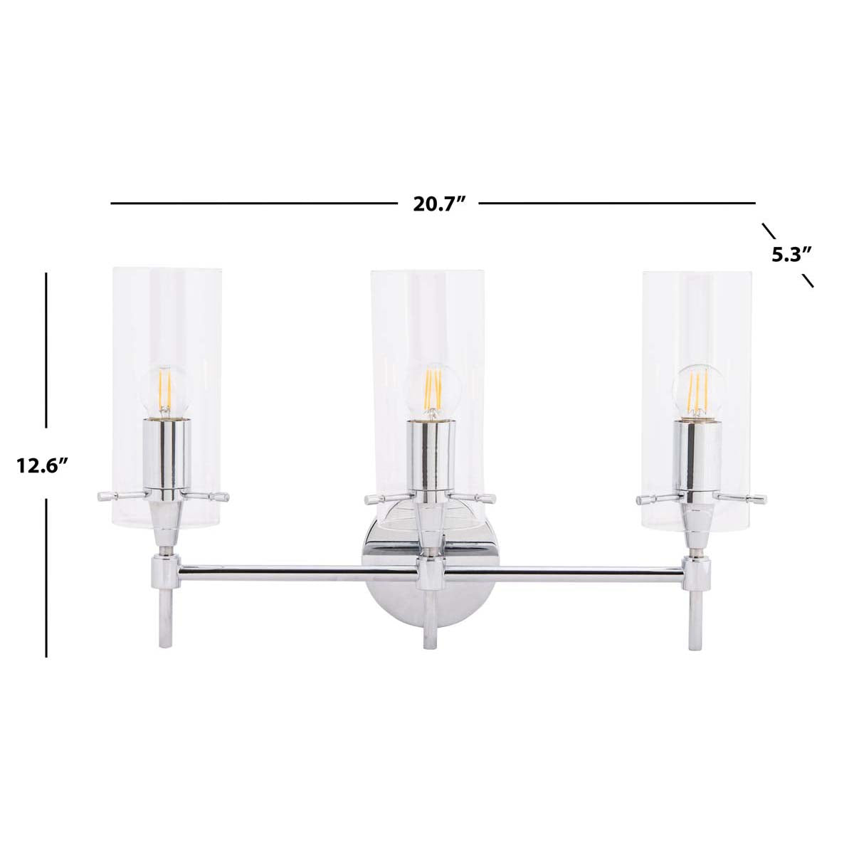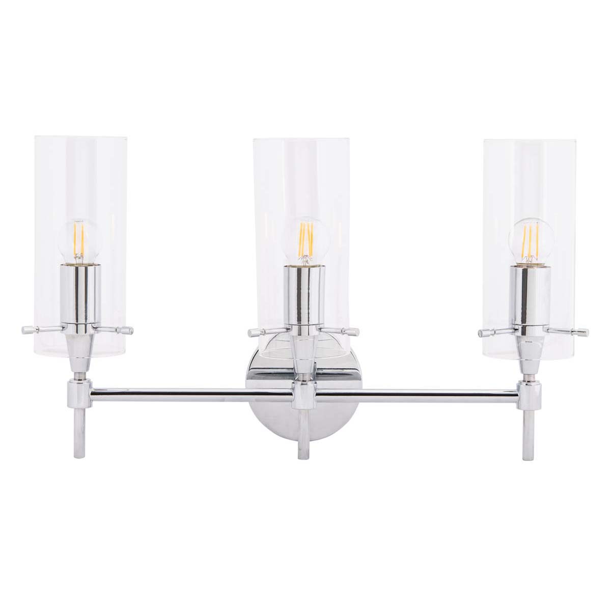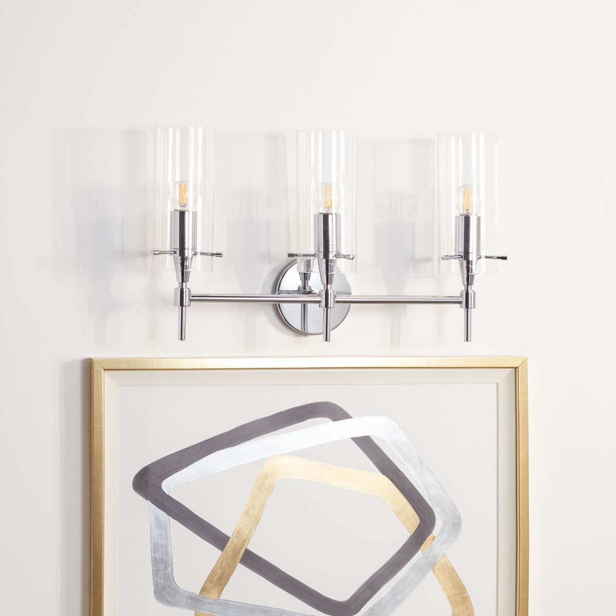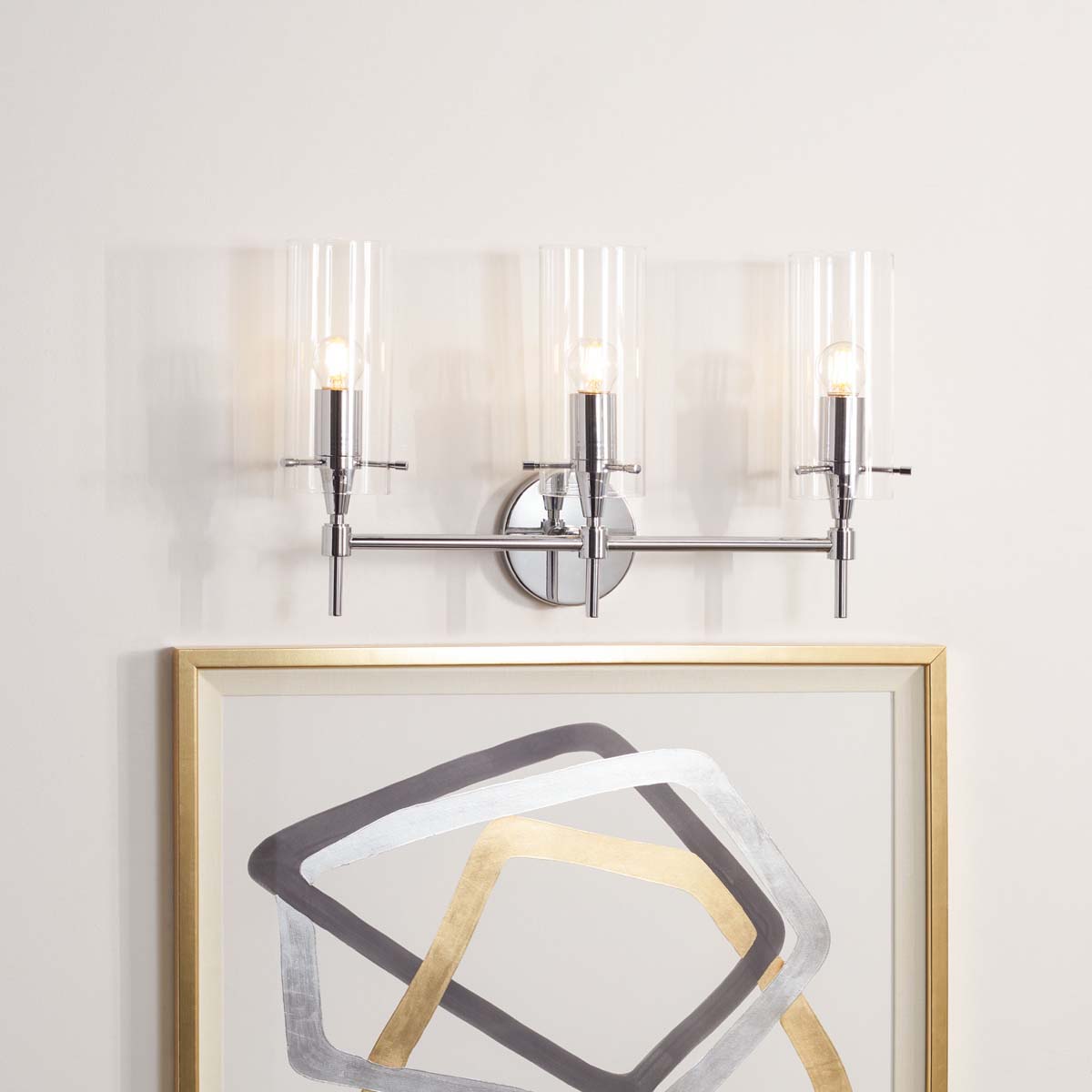 Designed to cast a sensational shimmer in any interior, this Norala Vanity Sconce is at once modern and classic. Norala?? three glass shades and industrial inspired bulb are highlighted by a sleek chrome frame, making it the d?cor smart choice above a mirror in both the boudoir and bathroom.
