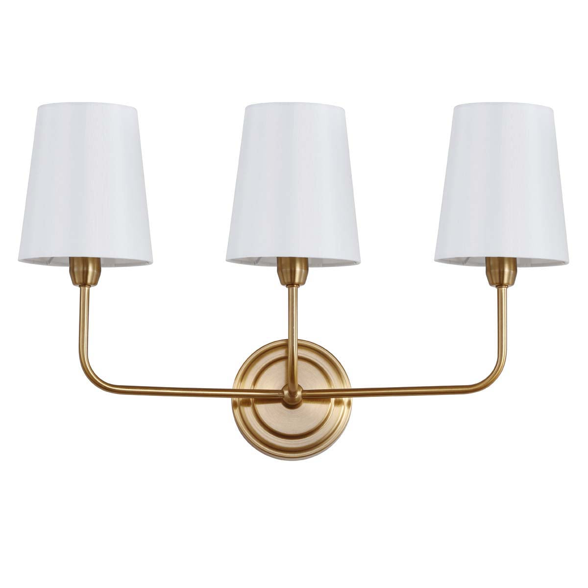 Designed to bring luxury to any living room or dining room, this elegant three light wall sconce boasts style and substance. Illuminated by ample lighting, its brass and gold finish shimmers alongside its off white cotton shades.