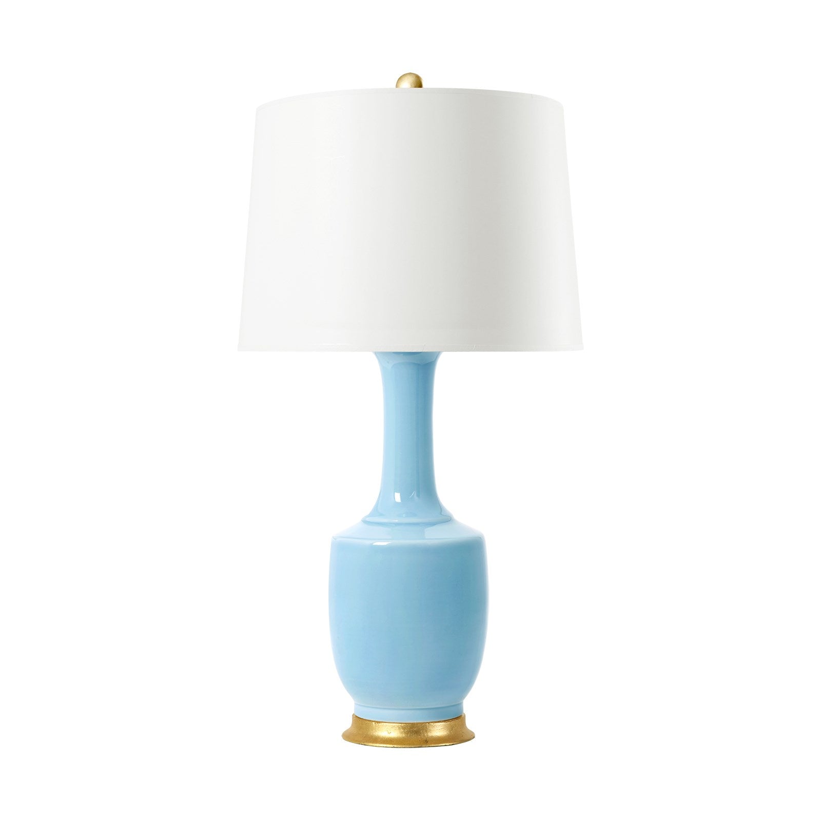 Combining classical pottery with a soft splash of color, the Safira Lamp feels at once unique and traditional. It strikes interest without overpowering a space, allowing it to beautifully complement a range of decor schemes. An updated take on the Yaolingzun or “Mallet-Shaped” vase dating back to China’s Ming Dynasty, the lamp’s body is crafted from glazed porcelain in light blue with an elegant, elongated neck and a slim, rolled collar atop the flared base. It’s completed with a gold leaf base and finial, gilded accents which elevate its look and provide glamorous shine. Top it with one of our signature shades to finish the look. Please note: Villa & House's lamp shades are sold separately.8.5dia x 33h