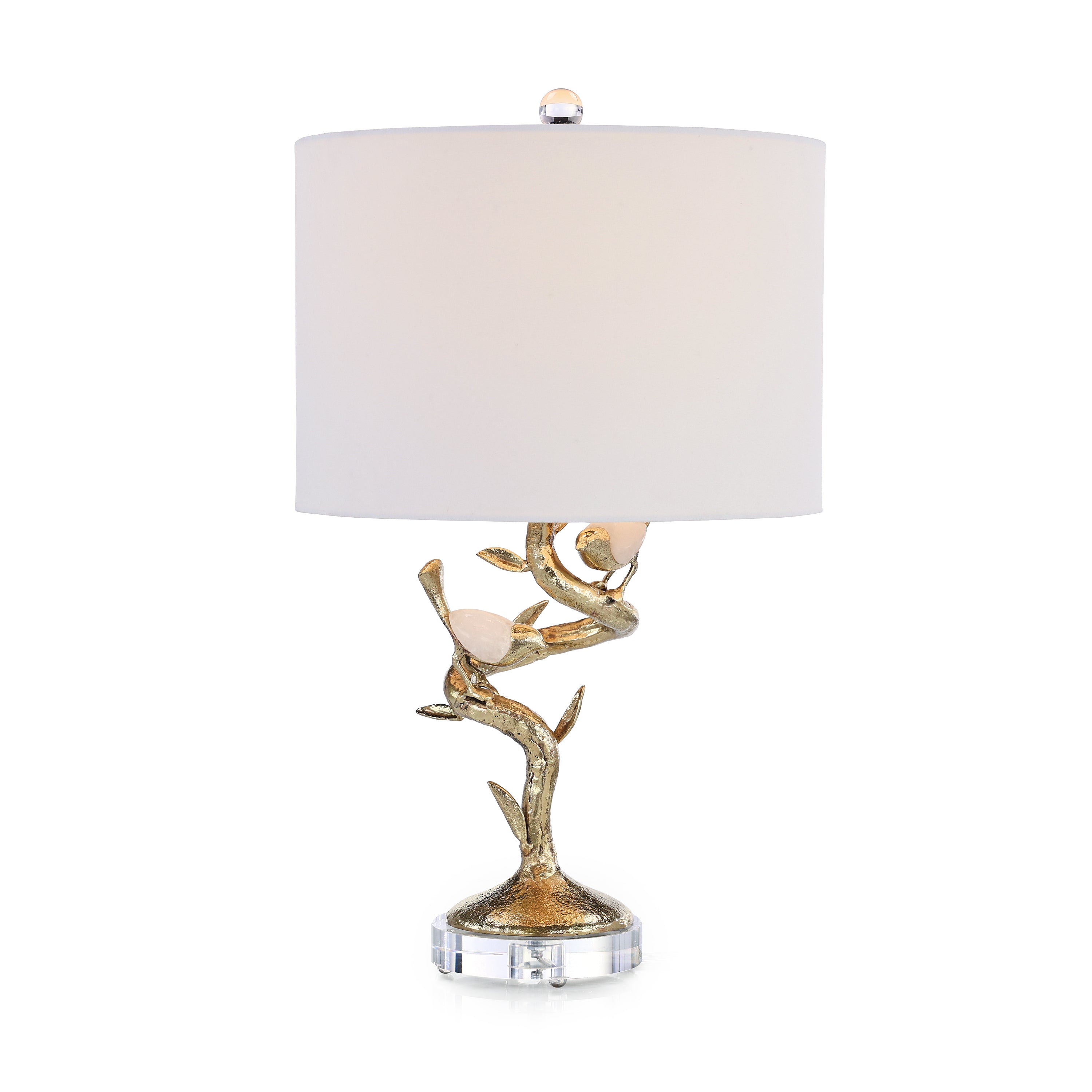 The Trespolo Table Lamp translates natural inspiration through the lens of contemporary design. Crafted from Polished Brass, the body displays the appearance of an opulent sapling with white stone birds gracefully perched near the top. The look is completed with a round acrylic base, acrylic ball finial, and a white drum shade.