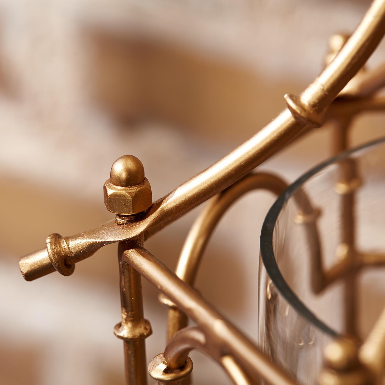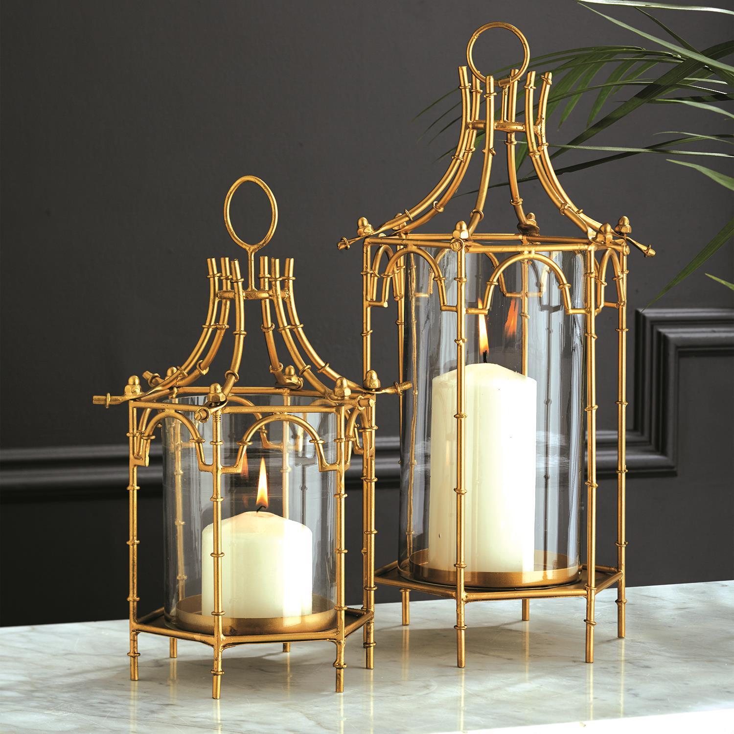 In ancient times, night travelers would carry oil lamps or candlelit lanterns. Bring a bit of that same antique charm to your home with this set of two glass pagoda lanterns with shimmering brass bamboo detail.