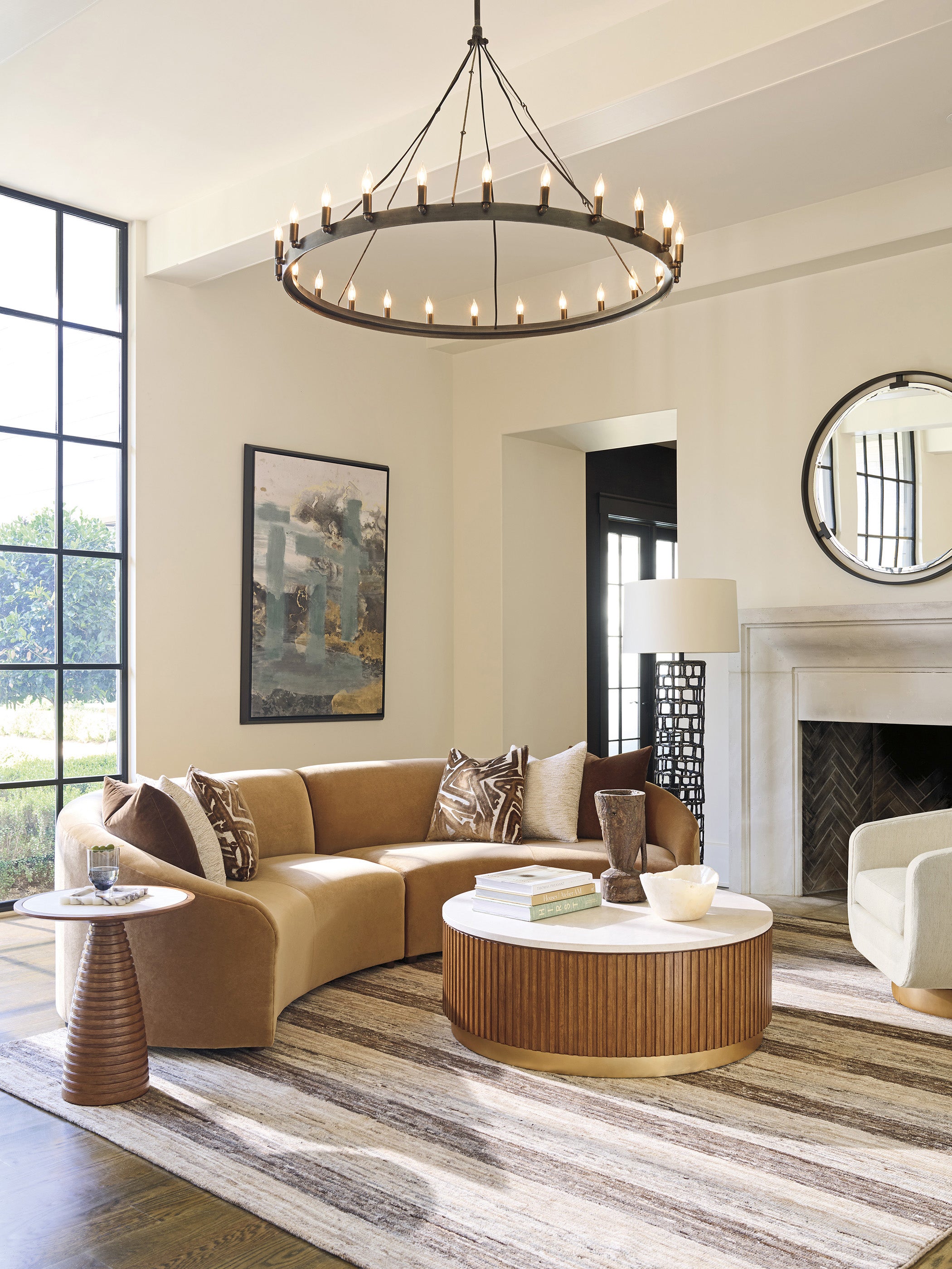 The Culver chairside table is a striking accent piece, crafted from fluted limestone around the base and a veneered limestone top.