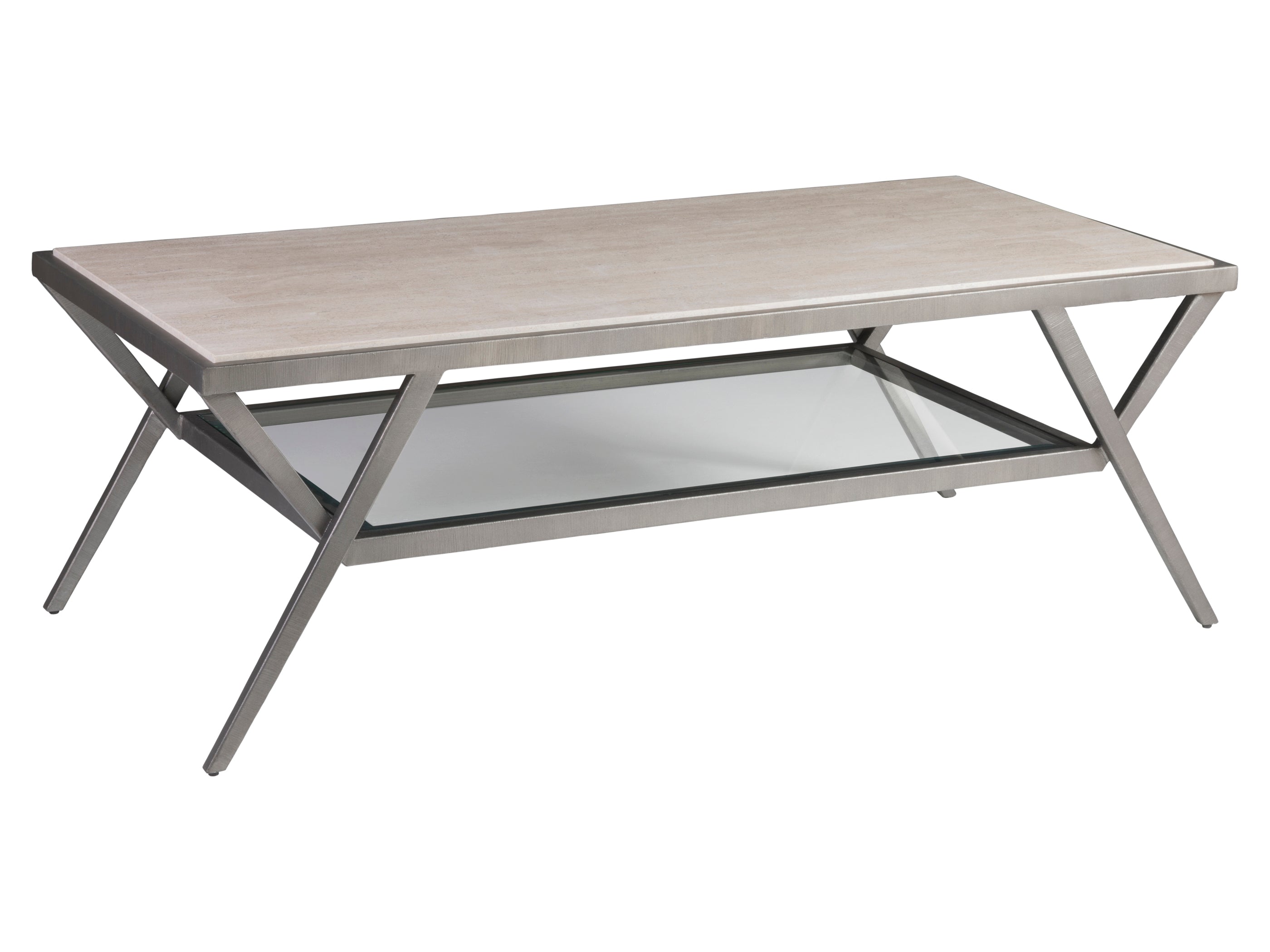 Steel base with tapered legs in a ribbed silver leaf finish with a White Vein travertine top and an inset beveled tempered glass shelf. Tops may vary in appearance and coloration from piece to piece. Steel base with tapered legs, tiled travertine top, inset beveled glass shelf.