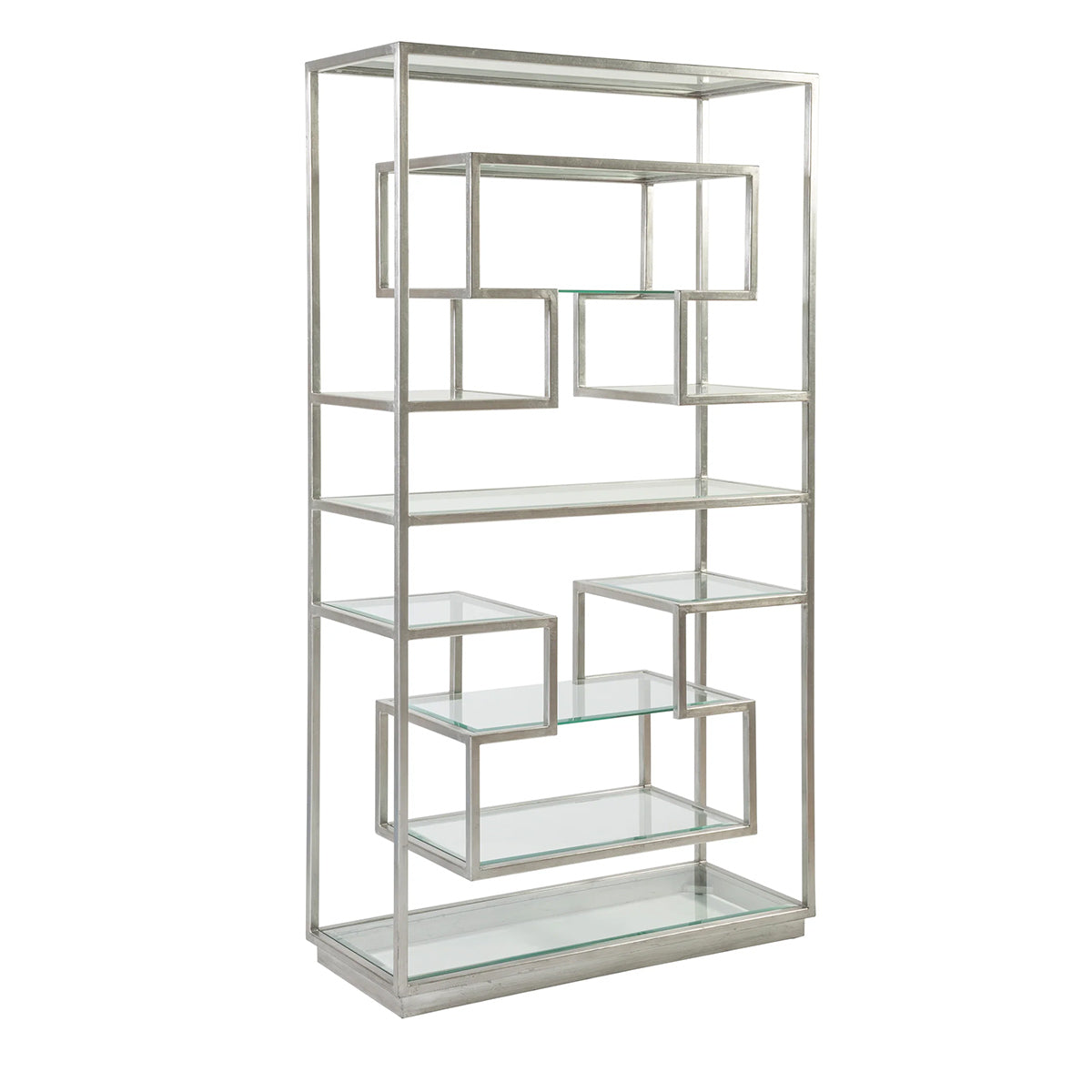Tubular steel frame with eleven inset,1-inch beveled glass shelves. Shown in true silver leaf with antiqued effect, but also available in all Artistica Metal Designs finishes. HOLDEN - 2012 Tubular steel frame, 11 beveled inset glass shelves. , METAL DESIGNS ,