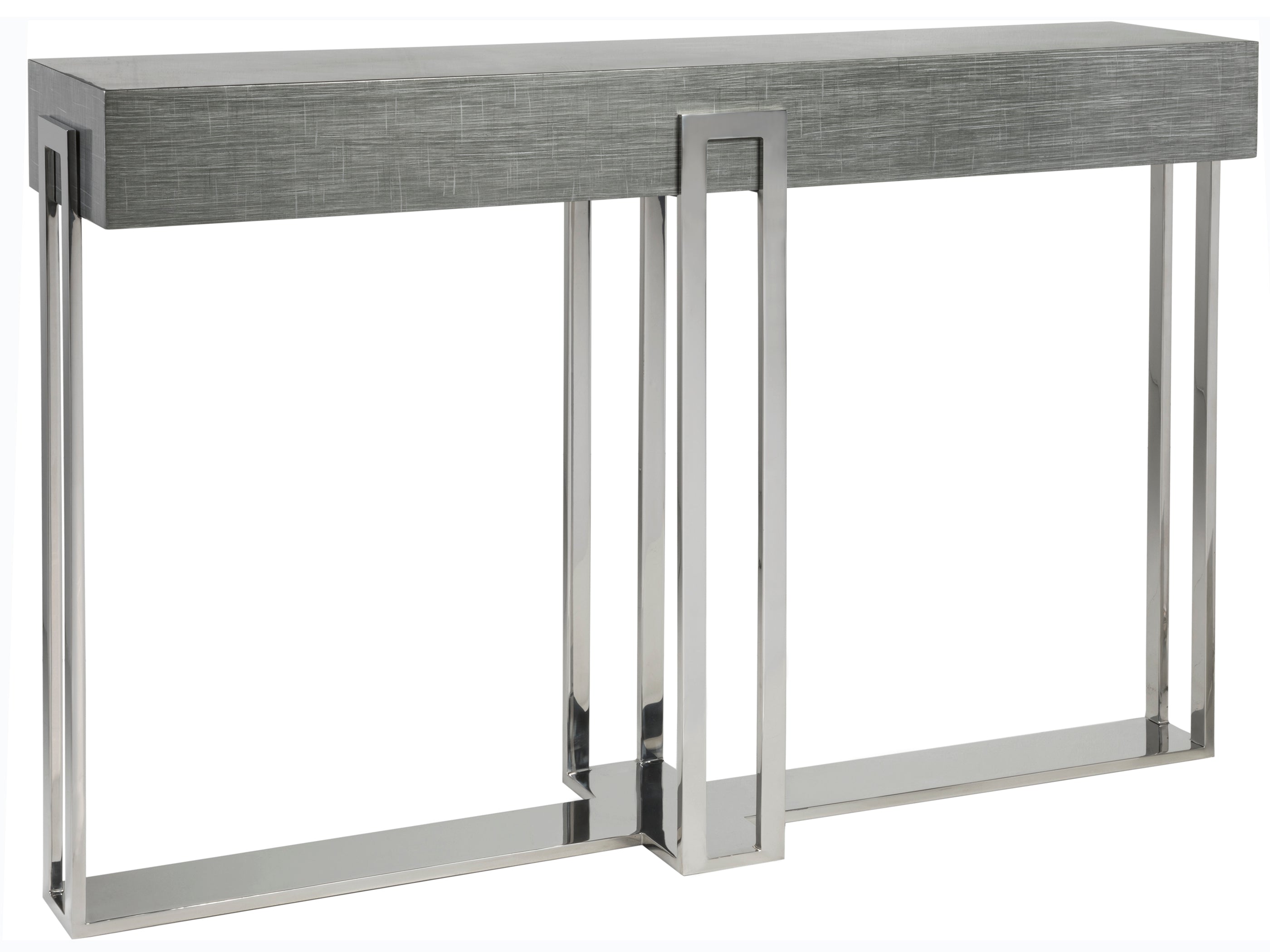 Contemporary design slab top is Beech solids and Maple veneers hand-painted by artists in a gray and silver crosshatch pattern over silver leaf, enhanced by a true lacquer finish. The polished stainless steel sled base has cutouts on the posts. Slab top, sled bases with cutouts on posts , SIGNATURE DESIGNS ,