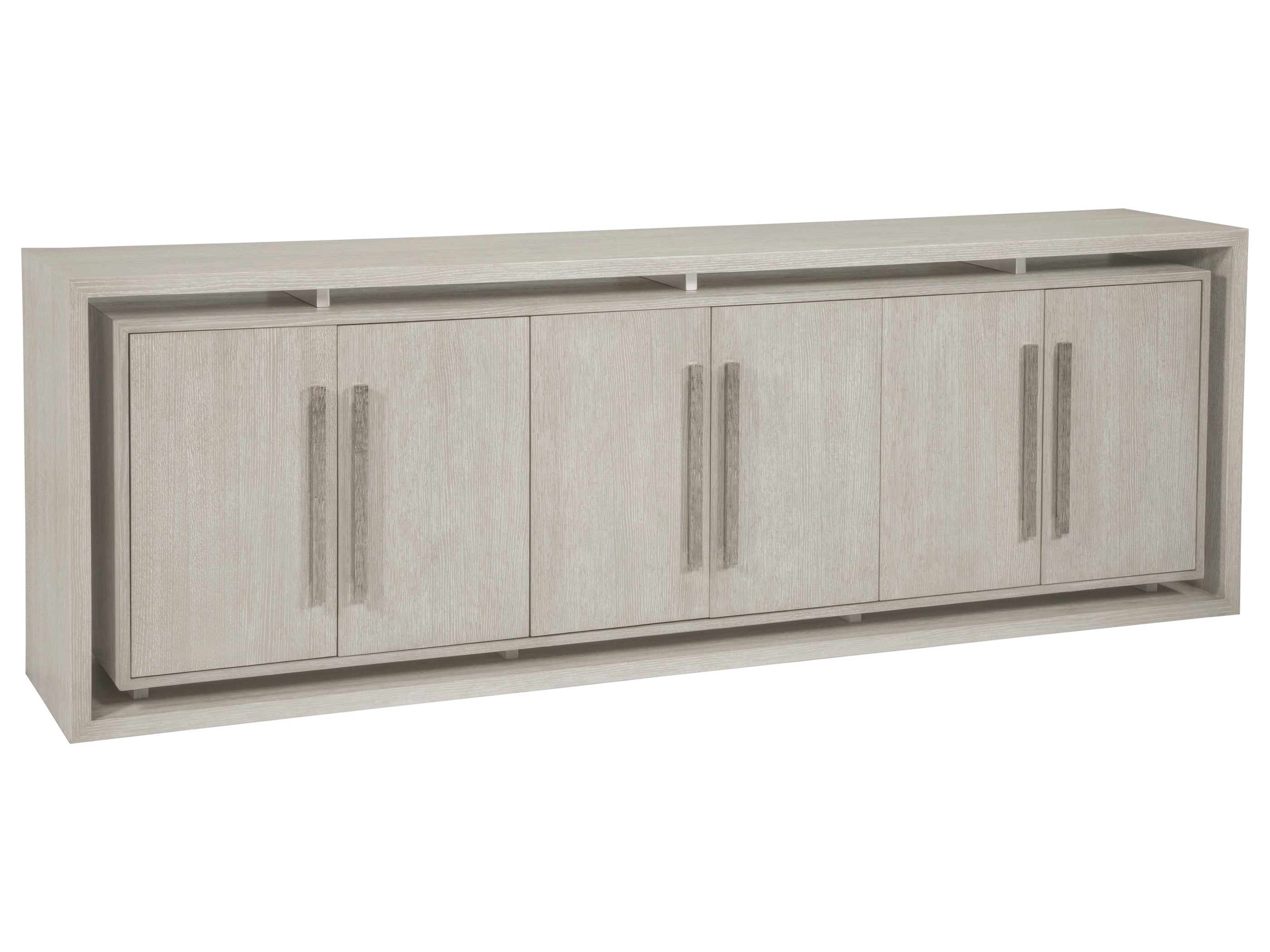 The longer media console incorporates negative space wherein the three pairs of doors appear to float within the case. The six doors with stainless steel accents, and nickel hardware, open to reveal six adjustable shelves. The ventilated back is designed with technology in mind. Our largest lifestyle collection was conceived to inhabit modern environments in both coastal and mountin settings, featuring original architectural designs dressed in linear quartered white oak veneers in a soft, champagne taupe liimed in an ivory ceruse. Complimentary element include leathered Anticato marble tops, stunning organic hardware in bright nickel, and metalwork clad in a slightly warm silver leaf finish. Six floating doors, six adjustable shelves, stainless steel accents, nickel hardware, ventilated back.