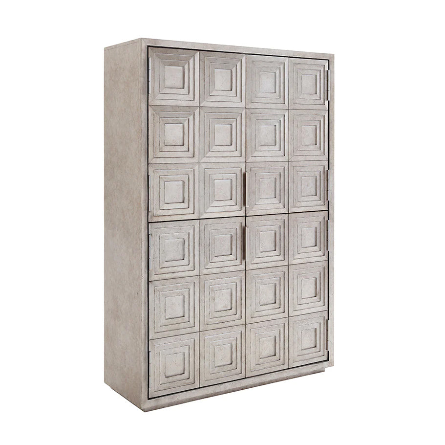 Anchor the room with this gorgeous cabinet that is remarkable multi-functional. Each of the four doors feature six step-down panels in hand-applied silver leaf. The top pair open to reveal two adjustable or removable shelves and a lower stationary shelf with removable shirt partitions between in a contrasting gray interior. The lower pair of doors reveal three open storage compartments with removable center partition and drop-front drawer for media or keyboard access. On the lower left are three adjustable shelves which may be removed. On the right are two adjustable shelves. Ariana offers a high-fashion take on modern luxe living, blending a hand-glazed platinum finish with sophisticated accents like burnished silver leaf, platinum-finished stainless steel, elegant silver gray drawer interiors and polished silver marble with veining in shades of taupe and gray.