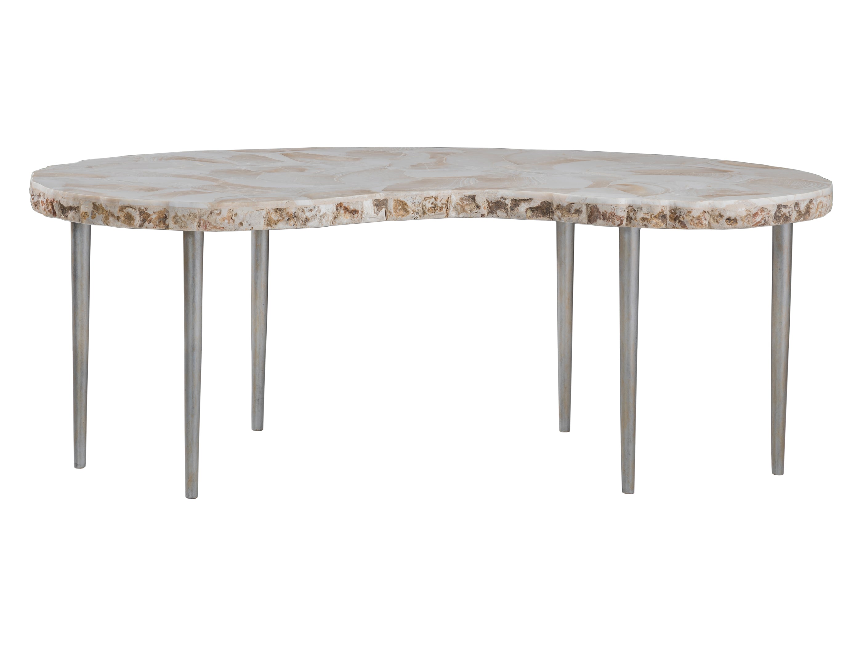 Asymmetrical, shapely live-edge cocktail inlaid with fossilized shell standing on tapered iron legs in a silver finish with a hint of gold. Tops will vary in coloration from top to top. Contemporary design with six round tapered iron legs in a silver finish with a hint of gold. , SIGNATURE DESIGNS ,