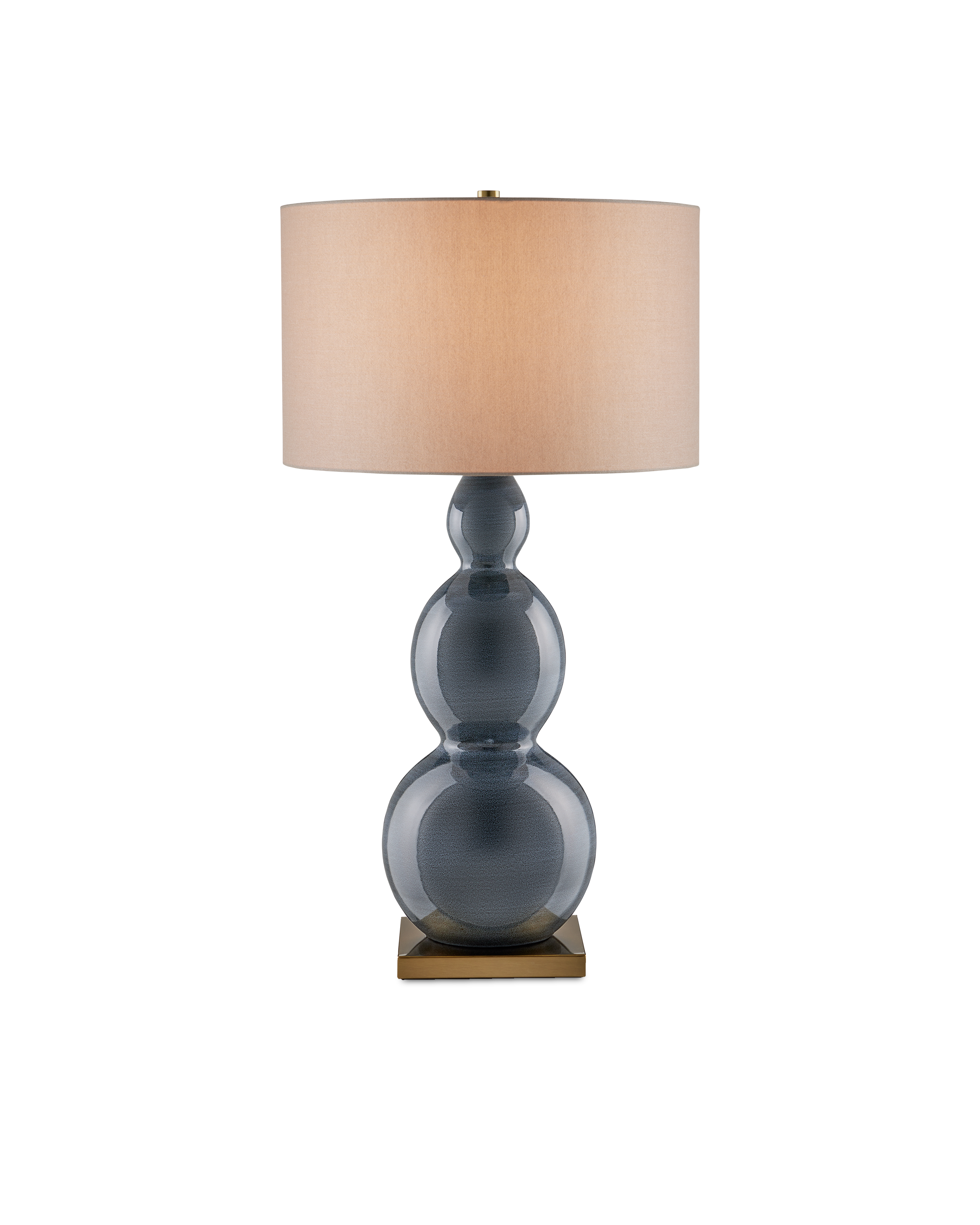 The Cymbeline Table Lamp has a triple-gourd shape with a surface that shines. The body of the lamp has a gray glazing that is stippled so delicately, it reads as one hue. The gray table lamp is topped with a natural linen shade and stands on a brass square base.