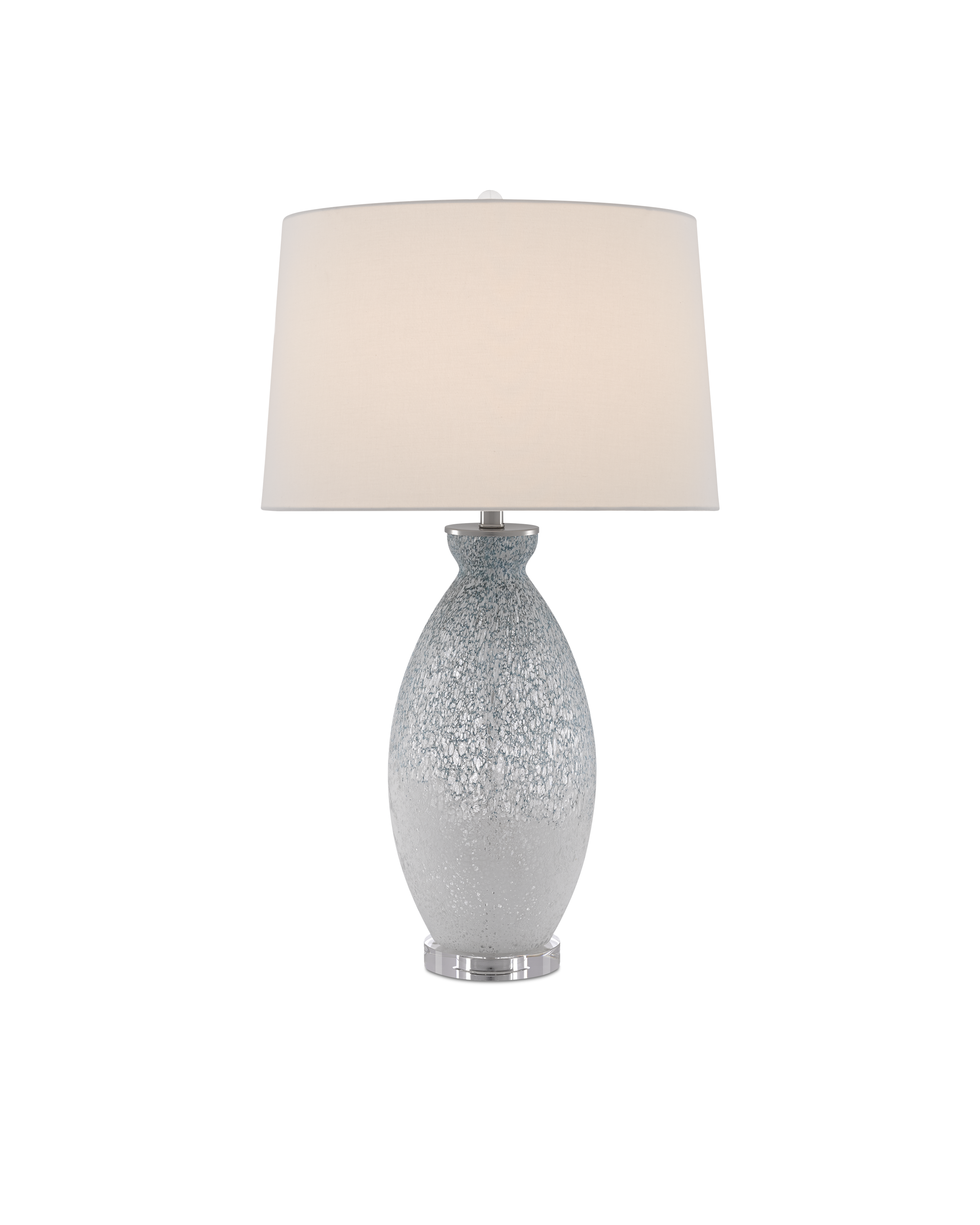 Like the moon rising out of fog, the body of our Hatira Table Lamp has a mysterious patterning on the clear glass body hand-applied in pale blue and white. We placed the pale blue lamp on an optical crystal base and topped it with an oversized off-white linen drum shade.